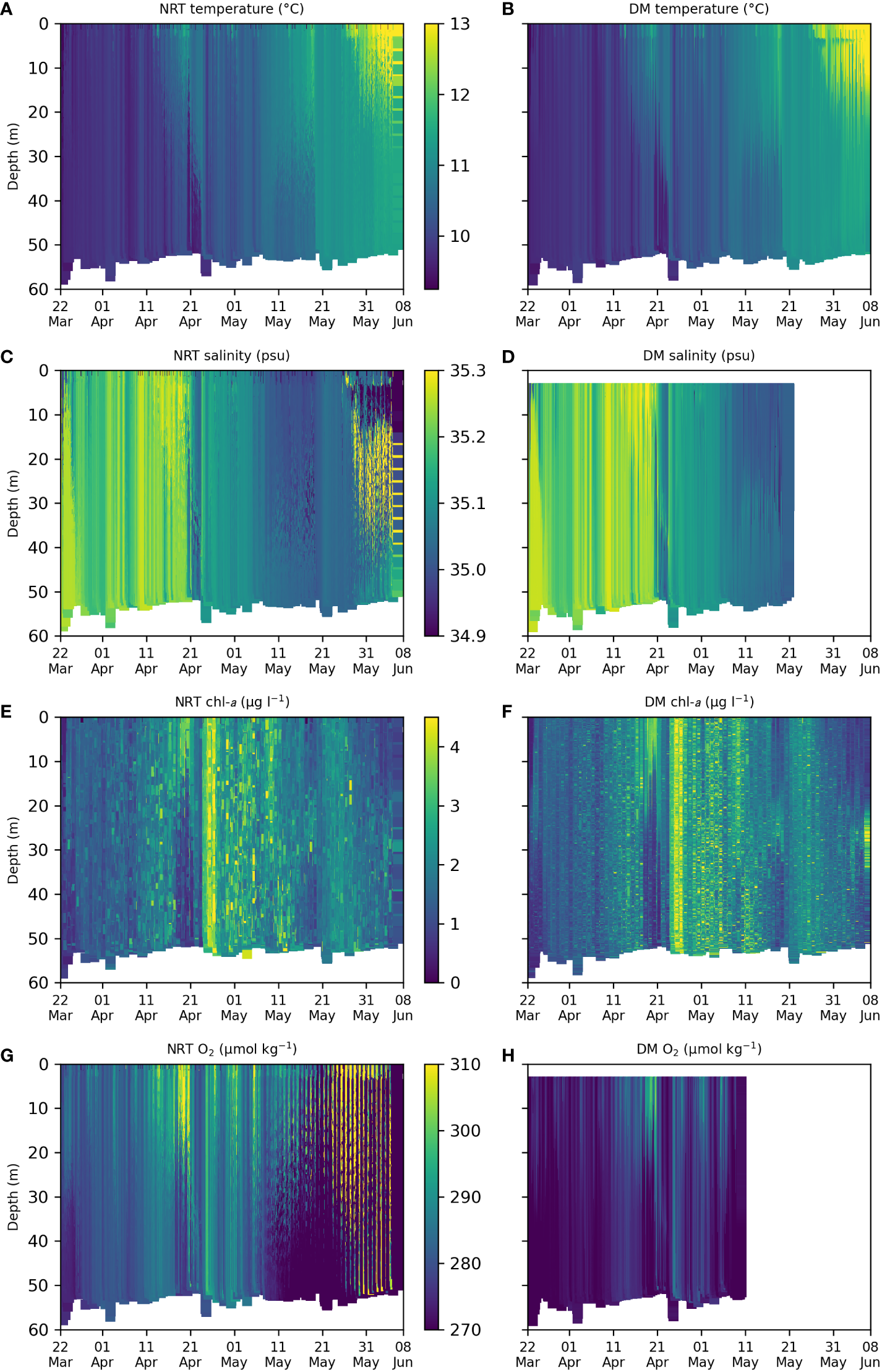 As mentioned in Section 2.1, significant biofouling occurred, particularly affecting the O2 and salinity measurements. This resulted in extremely noisy values in the NRT data for these variables towards the end of the experiment (Figures 4C, G), and the removal of these from the DM data (Figures 4D, H). Near-surface values from these variables were also removed from the DM data, as these depths were not properly resolved. Additional biofouling appeared to occur at the very end of the experiment for all sensors, but this could be corrected for in the DM data.