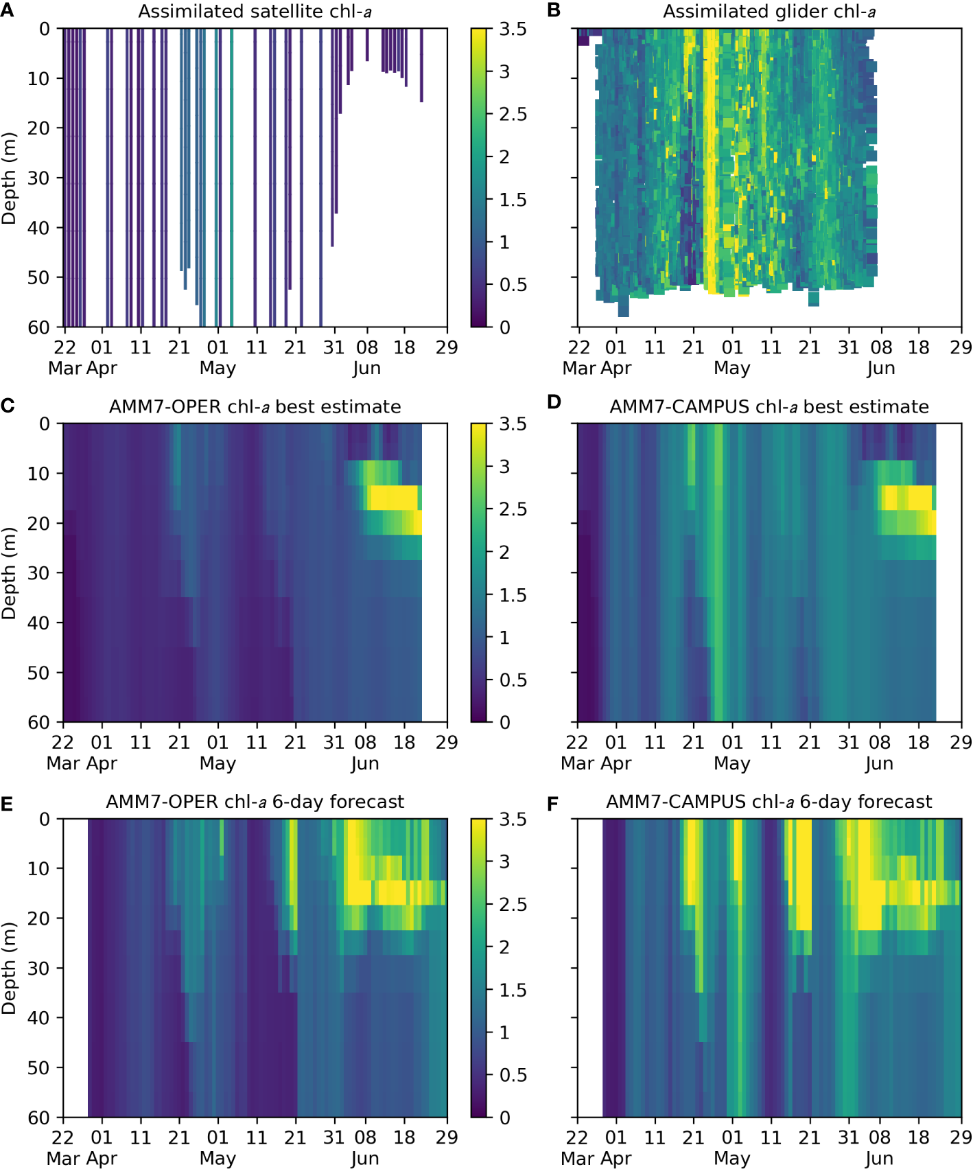 Glider chl-a values were typically higher than satellite chl-a, but with similar temporal variability. This difference carried through to the AMM7-CAMPUS best estimate, which assimilated both data sources, compared with AMM7-OPER which only assimilated the satellite data. Both models reproduced the observed blooms in late April, but these were much more prominent in AMM7-CAMPUS, especially the larger bloom in the glider data. Throughout the glider deployment, the water column was mostly well-mixed in the glider and model data, apart from some dates in mid-April and mid-May. Around the end of the deployment, near-surface chl-a reduced in both AMM7-OPER and AMM7-CAMPUS, and a DCM formed, as started to be seen in the glider data (Figure 4F). This DCM persisted until the end of the model run.