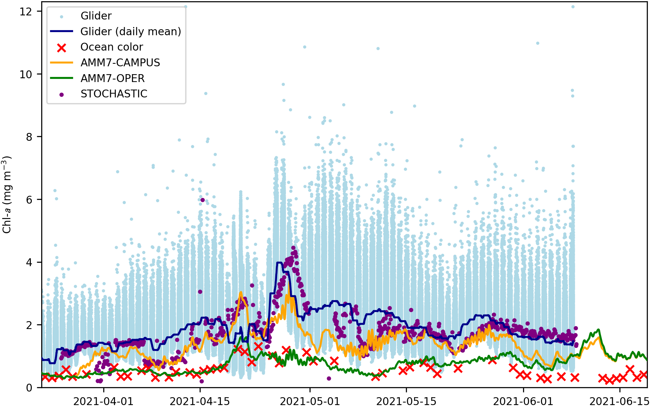 Figure 7 shows a time series of near-surface chl-a in the glider region from each data source. Shown are the nighttime glider observations in the upper 10 m, the daily mean of these observations, ocean color observations, hourly AMM7-OPER surface best estimate, hourly AMM7-CAMPUS surface best estimate, and four-hour predictions from STOCHASTIC. The glider observations show extremely large sub-daily variability, possibly due to the presence of phaeocystis colonies as discussed in Section 3.1, with less variability in the daily mean. As seen in Figure 4, the highest chl-a was a bloom in late April. The ocean color observations were all smaller than the glider daily mean, and mostly outside the range of variability in the nighttime glider data. The ocean color satellites are heliocentric, sampling at approximately local noon, when glider data have been excluded as they may be affected by fluorescence quenching. AMM7-OPER closely matched the ocean color data, except in June, while AMM7-CAMPUS was usually between the ocean color and glider observations in magnitude. STOCHASTIC was usually close to the glider daily mean. After the glider deployment ended, surface chl-a in the region in AMM7-OPER and AMM7-CAMPUS converged within a week, as soon as ocean color data were available and the analyses were being constrained by the same observations.