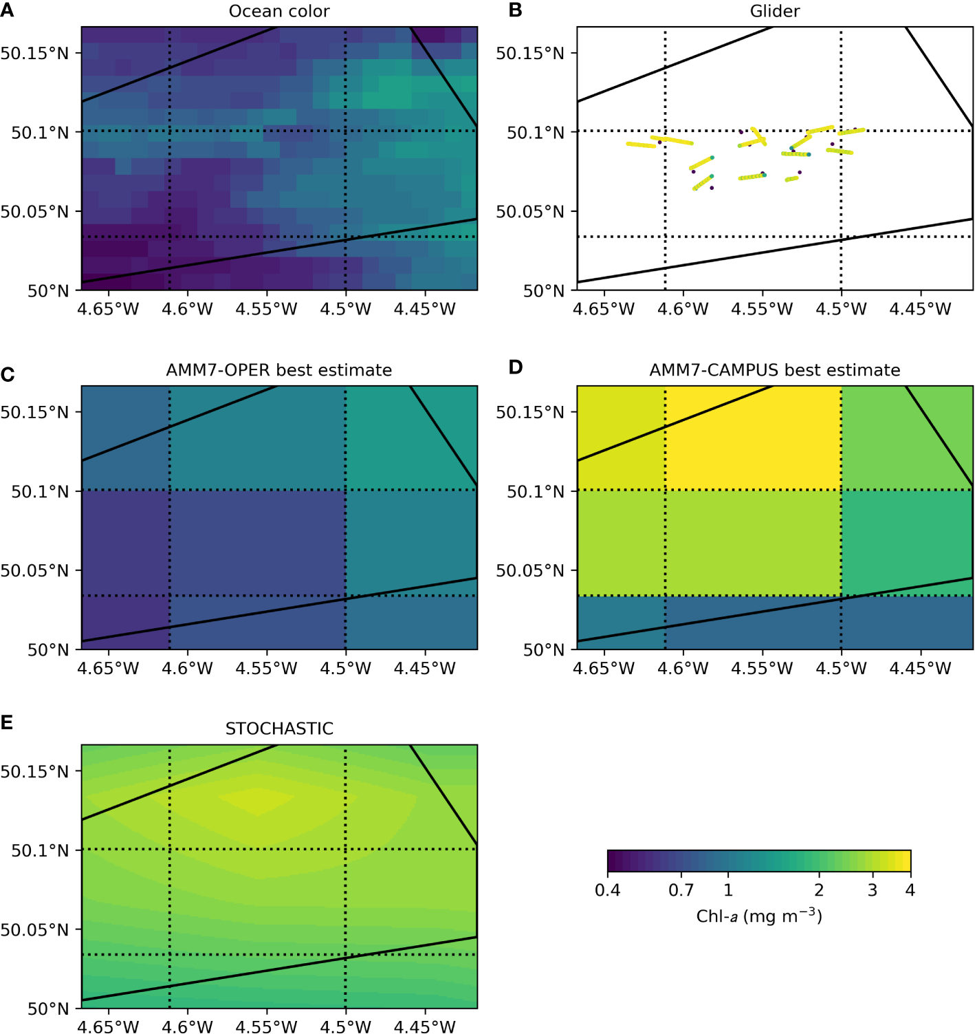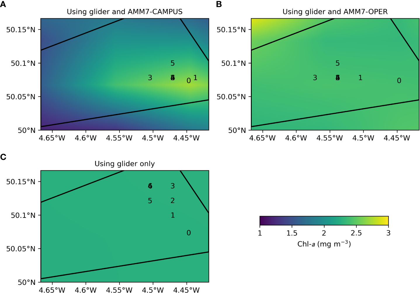 Ocean color data were taken from the CMEMS North Atlantic NRT product (https://doi.org/10.48670/moi-00284), which provides level 3 daily merged chl-a from the MODIS-Aqua, VIIRS, and OLCI-3A sensors. This is the same ocean color product as assimilated by AMM7-OPER and AMM7-CAMPUS. During the experiment, single-sensor ocean color data for the WEC was emailed daily to team members by NEODAAS (https://www.neodaas.ac.uk/), for monitoring purposes.