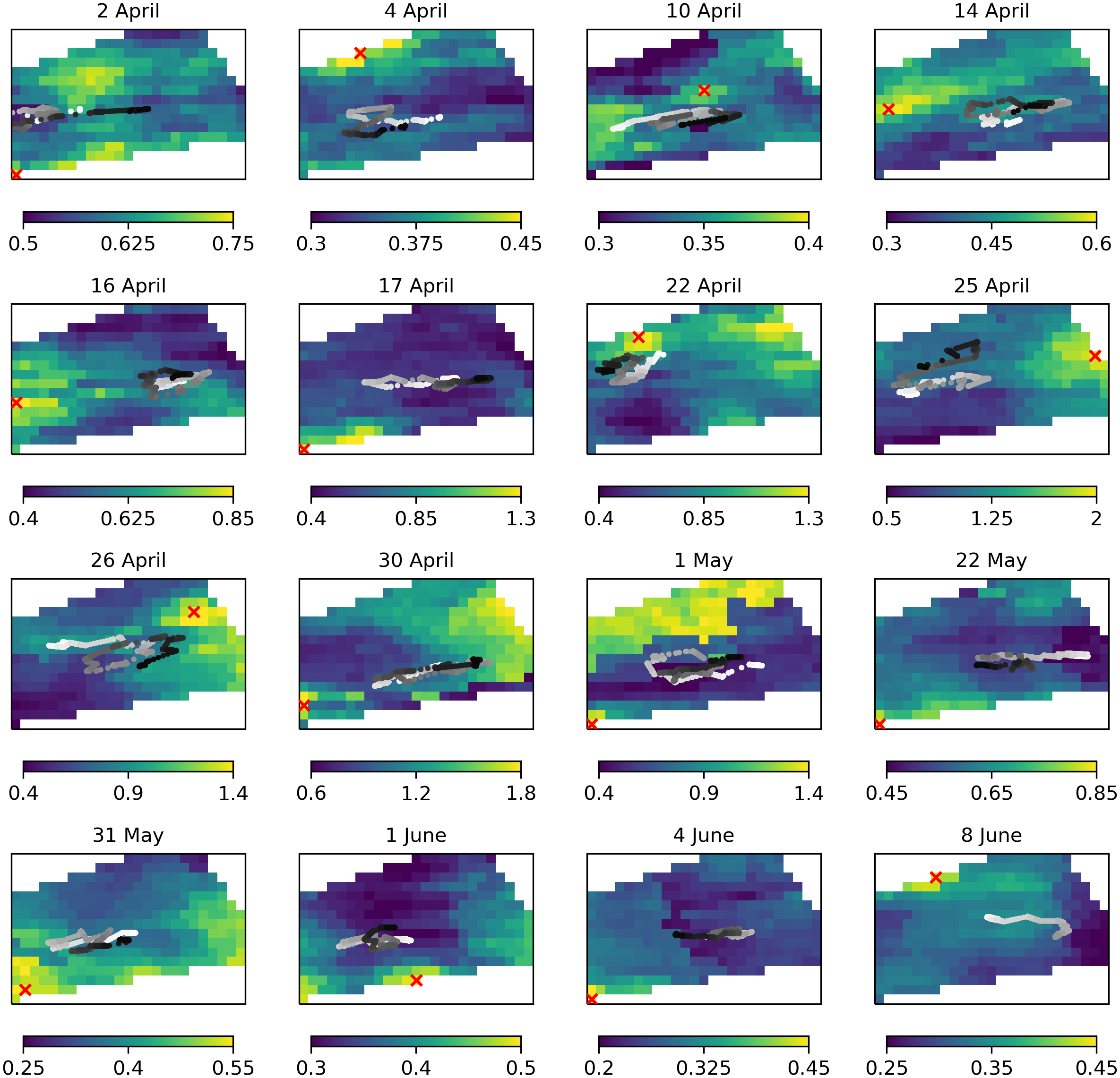 From the forecast a set of six waypoints was calculated, one at each 4-hourly interval of the 24-hour forecast, giving a series of locations to direct the glider towards over the next 24 hours. These were calculated as the locations where the maximum chl-a in the region was most likely to be, based on the predicted mean value and variance of chl-a on the forecast grid. Movement constraints were also accounted for. The waypoints were then communicated via email to the glider pilot in a fully automated process using a Linux bash script. Following an initial validation period, these waypoints were used to steer the glider from 26 March 2021 onwards.