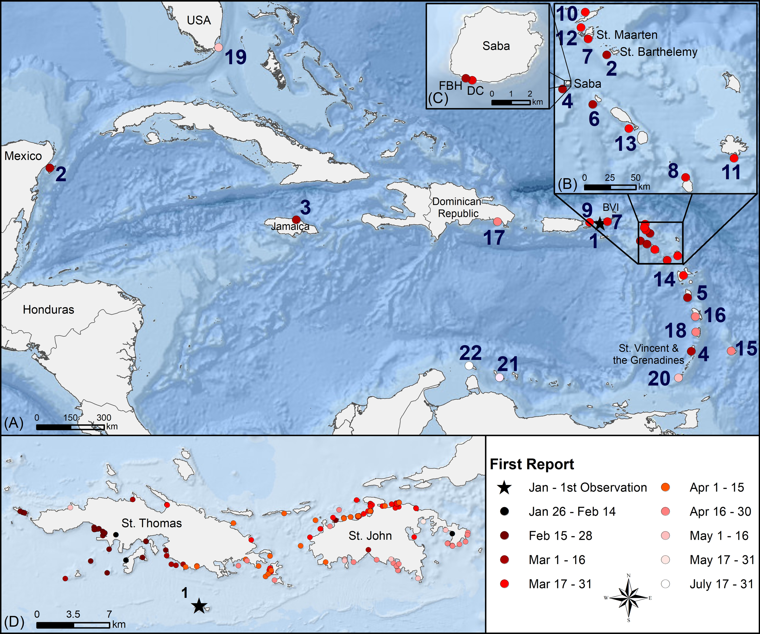 Affected D. antillarum were first observed in the USVI in late January 2022. However, this initial observation was not shared with the public until 16 February 2022, when a local diver posted his images from 8 February on social media. Upon seeing the die-off images, the Virgin Islands Coral Reef Advisory Group decided to use an existing citizen science reporting tool that had been developed to monitor the occurrence of Stony Coral Tissue Loss Disease (SCTLD) to launch a territory-wide Diadema tracking effort (https://www.vicoraldisease.org/sctld-disease-tracking). Through use of social media and newspaper articles the USVI public was informed of the die-off and urged to make reports to the online database of healthy, sick, or dying urchins. Observations from local community members, recreational divers, and the research community, some extending back to early February, were collected in the online database and reviewed to track the die-off spread in real time. All observations were verified via email or via submitted photos. Together with entries in the Diadema Health Tracking database (see below) this resulted in 209 observations of D. antillarum mass mortalities in St John and St Thomas. For the purposes of this publication local spread at these islands was documented through the end of May 2022.
