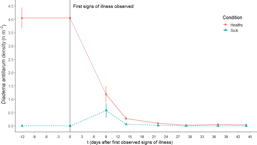 Before 1983, D. antillarum was the most abundant herbivore on Caribbean coral reefs, as herbivorous fish were already severely overfished in many locations (Jackson et al., 2001; Pandolfi et al., 2003). The species’ importance in controlling algal growth became clear after a Caribbean wide die-off in 1983 and 1984. This mass mortality was one of the most extensive and severe die-offs ever recorded for a marine invertebrate (Lessios, 1995) and it is assumed that no D. antillarum population escaped its effects (Lessios, 2016). The lethality of the die-off in the 1980s was drastic, as populations were reduced, on average, by 98% (Lessios, 2016). Within five days after D. antillarum populations succumbed, turf algal communities increased 20% in biomass and their primary productivity plummeted (Carpenter, 1988). In the years that followed, stony coral and crustose coralline algal cover started to decrease, while filamentous algal turfs and macroalgae became the dominant benthic groups on many reefs (Carpenter, 1986; de Ruyter van Steveninck and Bak, 1986; Liddell and Ohlhorst, 1986; Hughes et al., 1987; Carpenter, 1990) and inhibited coral recruitment (McCook et al., 2001; Box and Mumby, 2007; Arnold et al., 2010). Coral recruitment failure reduced the ability of Caribbean coral reefs to recover from other disturbances (Mumby et al., 2007), such as coral diseases, bleaching events and hurricanes, which led to their stepwise degradation (Hughes, 1994; Jackson et al., 2014). The catastrophic effects of the D. antillarum die-off were summarized by Lessios (2016): “The 1983–1984 mass mortality of the long-spined black sea urchin D. antillarum in the western Atlantic stands out for its sudden onset, intensity, geographic extent, and impact of the loss of a single species on entire ecological communities.”