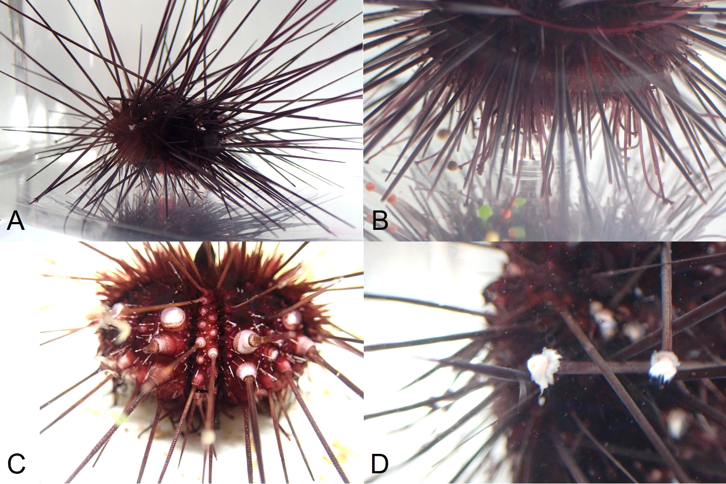 Signs of illness of D. antillarum during the 2022 die-off as reported in this study. (A) Standing on spines, tube feet lack suction power. (B) Standing on spines not being able to use tube feet. (C) Necrosis of epidermis and spine loss. (D) Tissue around broken spines sloughs off.