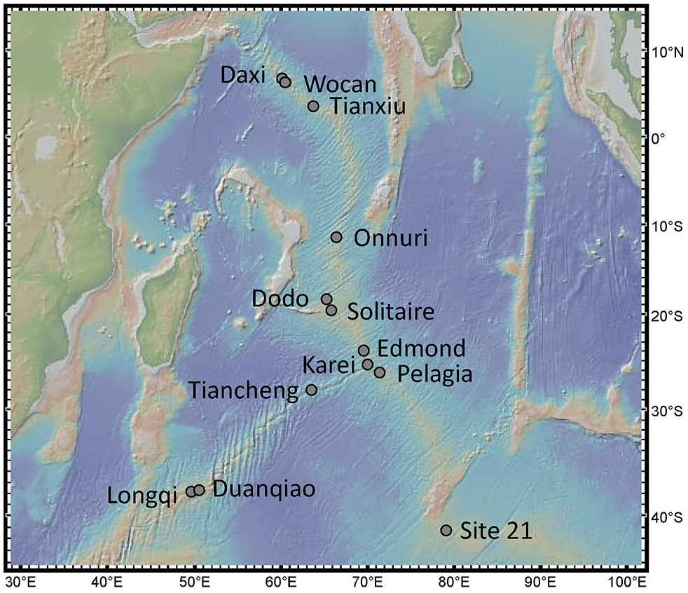 In this study, we assessed 13 vent fields with confirmed activity from the Indian mid-ocean ridges from the Carlsberg Ridge (CR) to the Central Indian Ridge (CIR), the South-East Indian Ridge (SEIR), and the South-West Indian Ridge (SWIR): Daxi, Wocan, Tianxiu, Onnuri, Dodo, Solitaire, Edmond, Kairei, Pelagia, Tiancheng, Duanqiao, Longqi, and Site 21 (Figure 1).