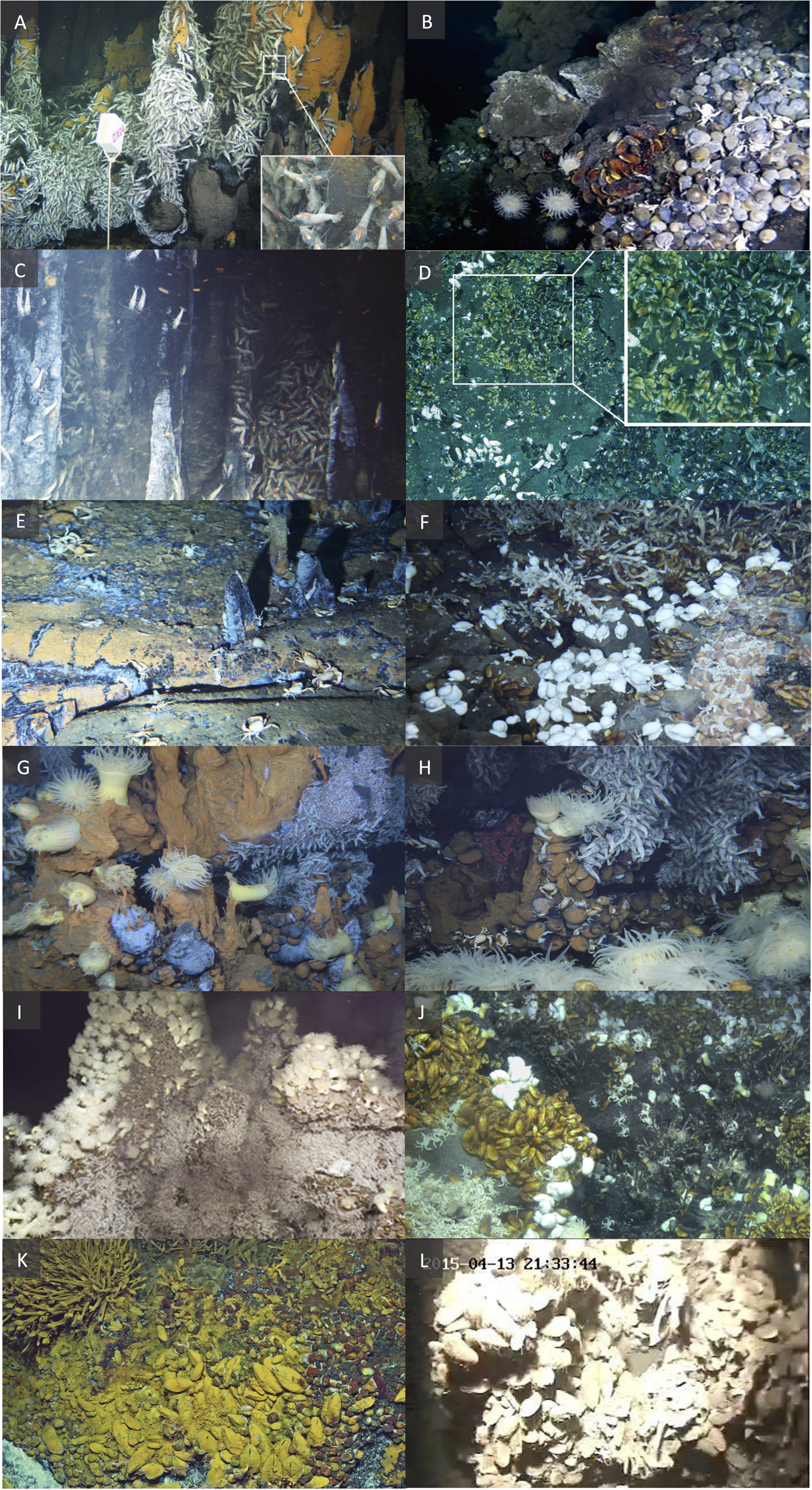A selection of ecological features for each active Indian hydrothermal vent. (A) Extensive swarms of alvinocaridid shrimps at Daxi. (B) Snails, mussels, crabs, shrimps, and anemones near a black smoker at Wocan. (C) Alvinocaridid shrimp swarming on massive sulfide structures at Tianxiu. (D) Dominant mussel species Bathymodiolus marisindicus (yellow brown) and Gigantidas vrijenhoeki (dark brown) at Onnuri. (E) Sparsely distributed anemones and bythograeid crabs at Dodo. (F) Diffuse flow vent assemblage with mussels, different snails and barnacles at Solitaire. (G) Dense alvinocaridid shrimp aggregations surrounded by snails and anemones at Edmond. (H) High densities of shrimps, snails, crabs and anemones at Kairei. (I) Layered shrimp, mussel and anemone aggregations on a chimney structure at Pelagia. J) Mussel beds with patches of snails, crabs and shrimps at Tiancheng. (K) Tiamat chimney dominated by peltospirid snails, alongside dense mussel and barnacle colonies at Longqi. L) Mussel dominance at Duanqiao. Image credits; (A)Wang et al., 2021 rightslink # 5441960651432); (B)Qiu et al., 2021 (rightslink # 5441961199302); C) Zhou et al., 2022 (CC BY); (D)Jang et al., 2020 (rightslink # 5441970372620); (E, F, G, H)Beedessee et al., 2013 (CC BY); (I)Gerdes et al., 2019 (CC BY); (J)Sun et al., 2020 (CC BY); (K)Chen et al., 2021a. (rightslink # 5443111350852); (L) image from powerpoint presentation by Dr C.B. Soon at ISA workshop in Poland in 2018 (photo courtesy of COMRA).