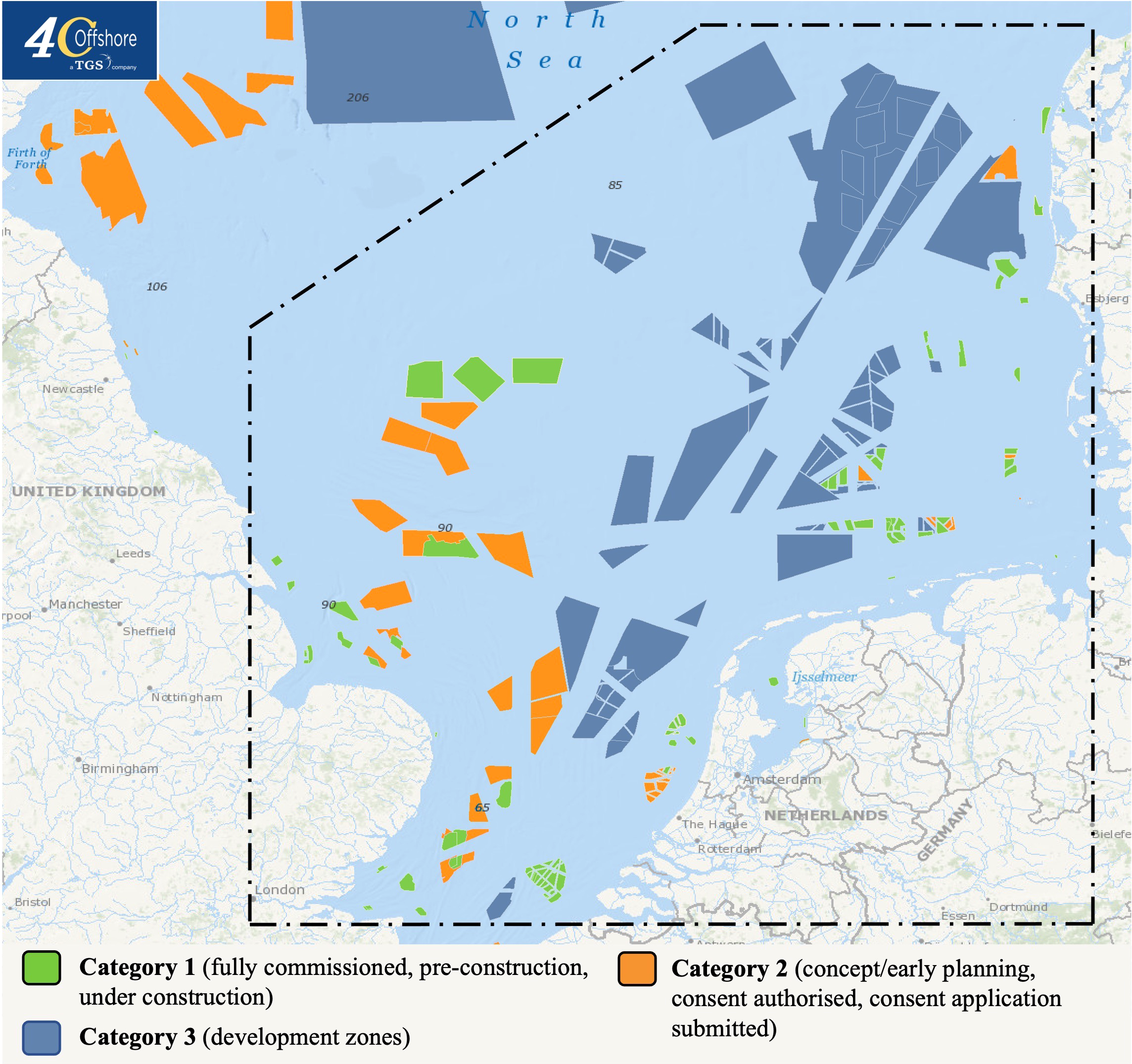 Study area in the SNS. OWFs are divided into three categories based on their construction and planning status as of 2022. Category I includes fully commissioned, pre-construction and under construction wind farms (green), category II includes consent application submitted, consent authorized and concept/early planning wind farms (orange) and category III includes development zones (blue) (edited map from 4C offshore (2022)). For our calculations, we focus on OWFs of category I and II.