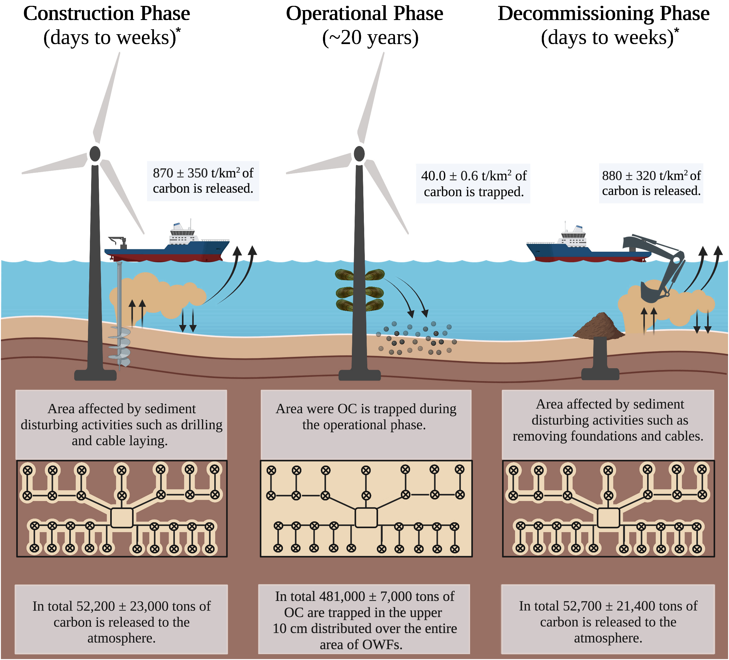Impacts of different life cycles (construction phase, operational phase, decommissioning phase) of OWFs on the sediment and the resulting trapped and released organic carbon (OC) in the upper 1 m of the sediment. The area affected during the different life cycles is highlighted (light brown). The absolute values apply to the entire area of the OWFs in the Southern North Sea (SNS). For the construction and decommissioning phases, we round the values to one figure after the first significant figure to illustrate their minor differences.*The period refers only to the duration of sediment-disturbing activities of individual elements of OWFs, such as individual cables and individual turbines, and not to time needed to install the entire wind farm or to the duration of all processes involved in construction or decommissioning, i.e. the time for installation of the rotor blades is not considered, for example.