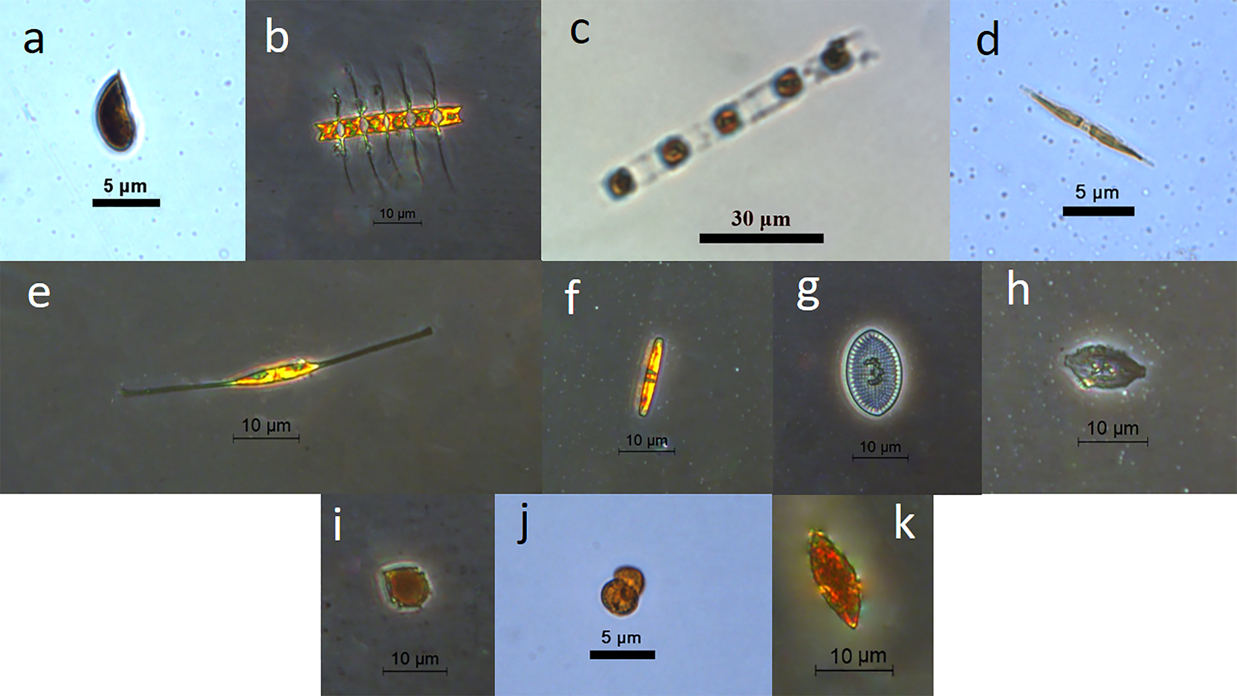 Some dominant phytoplankton species in this study. (A) Cryptophytes sp.; (B)Chaetoceros sp.; (C)Skeletonema costatum; (D)Pseudo-nitzschia sp.; (E)Nitzschia sp.; (F)Pinnularia sp.; (G)Cocconeis scutellum; (H)Amphora sp.; (I)Gonyaulax spinifera; (J)Gymnodinium sp.; (K)Gyrodinium spirale (A cryptophytes; B, C: centric diatoms; D–H: Pennatae diatoms; I–K: dinoflagellates).