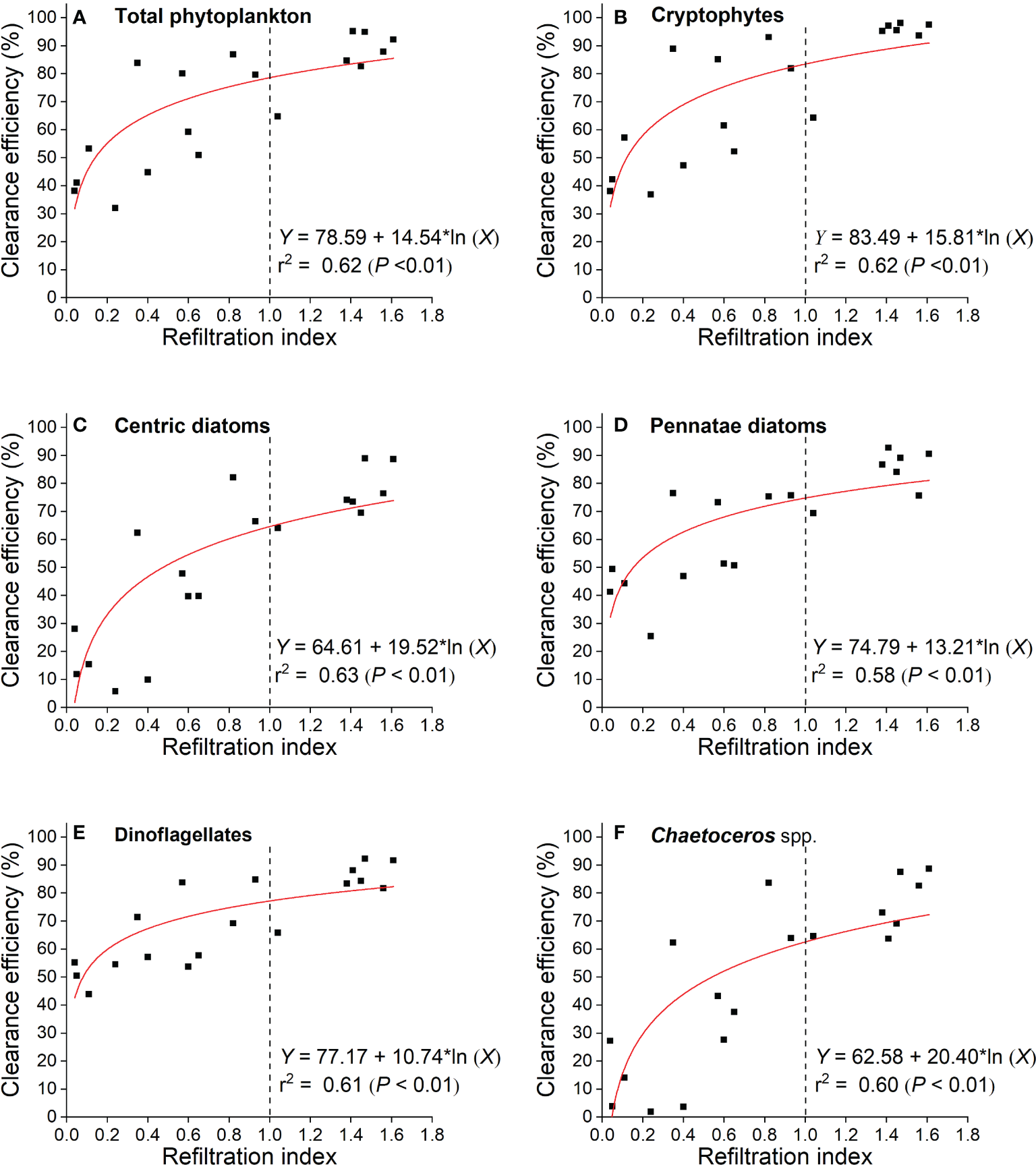 Given that the RI by M. coruscus varied between individual mussels in the experiments (Table 1), the clearance efficiency of phytoplankton cells was explored in relation to refiltration index (RI) (Figure 3) rather than comparing the proportions of phytoplankton before vs. after feeding experiments (Figure S1). Significant statistical relationships were found between RI and total phytoplankton cells (F=247; P< 0.01), as well as different groups (P< 0.01) (Figure 3). Moreover, these relationships revealed a differential clearance efficiency for the different algal groups. For a RI of 1.0, cryptophytes had the highest clearance efficiency (83%) while centric diatoms had the lowest (63%) (Figures 3B, F, respectively).