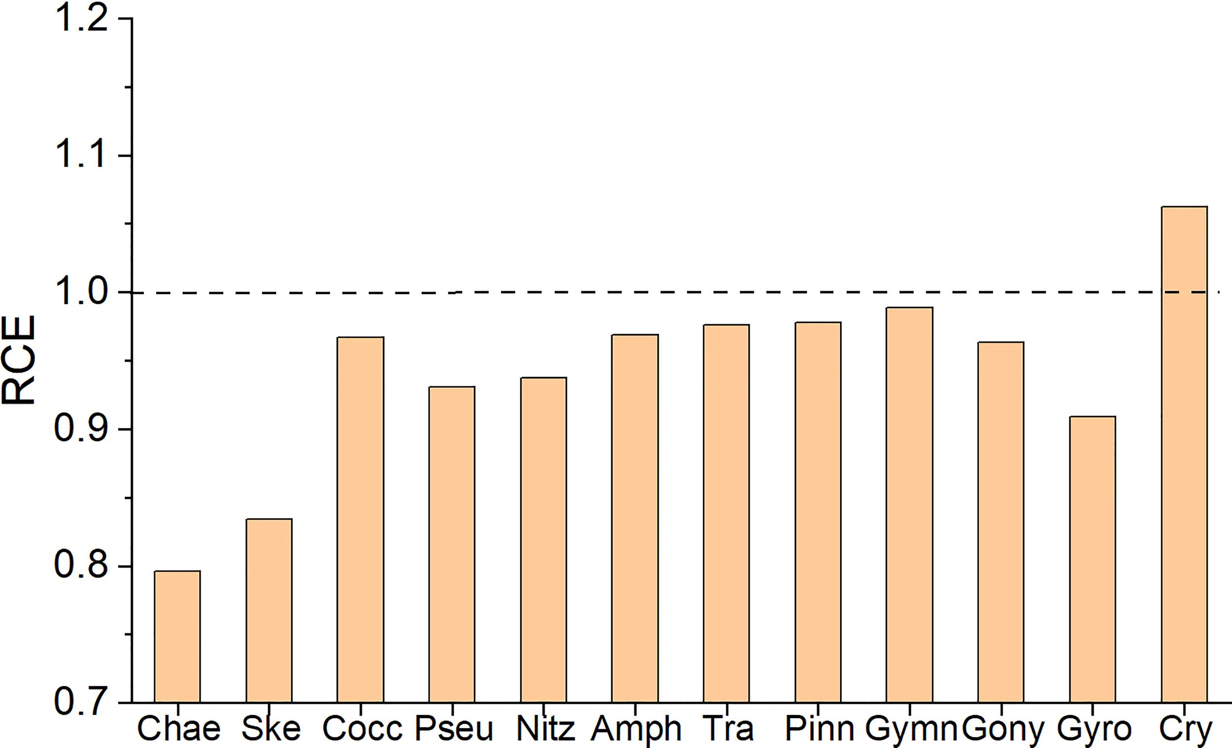 The ratio of clearance efficiency (RCE) of dominant phytoplankton assemblages against total phytoplankton at Refiltration Index = 1. The following abbreviations were used for the different communities: Chae, Chaetoceros spp.; Ske, Skeletonema spp.; Cocc, Cocconeis spp.; Pseu, Pseudo-nitzschia spp.; Nitz, Nitzschia spp.; Amph, Amphora spp.; Tra, Trachyneis spp.; Pinn, Pinnularia spp.; Gymn, Gymnodinium spp.; Gony, Gonyaulax spp.; Gyro, Gyrodinium spp.; Cry, cryptophytes.