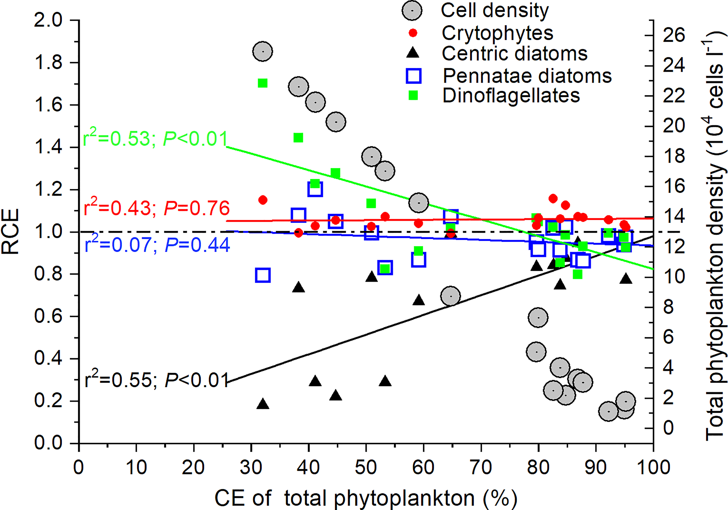 The relationship between the ratio of clearance efficiency of different phytoplankton groups against total phytoplankton (RCE) and CE of total phytoplankton by M. coruscus.