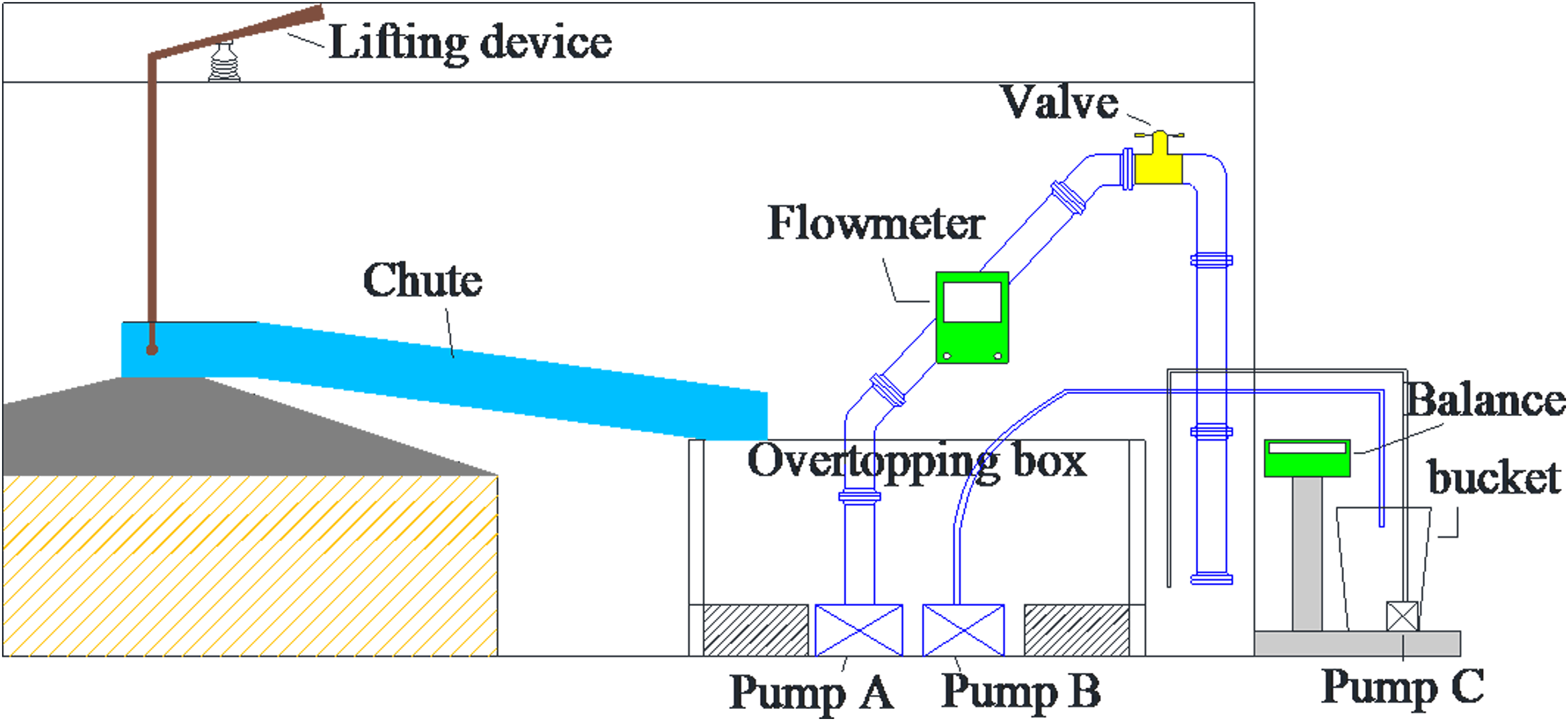The average overtopping discharge was measured at the inside of the tested section by collecting the overtopping water (over a width of 0.1 m) via an overtopping chute (a lifting device was installed in the front of the chute, which enables placing and removing the chute from the dike crest quickly) into the overtopping box (equipped with two large pumps). A larger pump (pump A) was connected with a Φ10-cm steel pipe to the back of the wave flume, and a flow meter was placed on the steel pipe. A smaller pump (pump B) was connected with a plastic pipe to a bucket that is constantly weighed on a balance. Pump C was used to pump the water from the bucket to the wave flume in order to keep the water level unchanged in the wave flume during the test (see Figure 3).