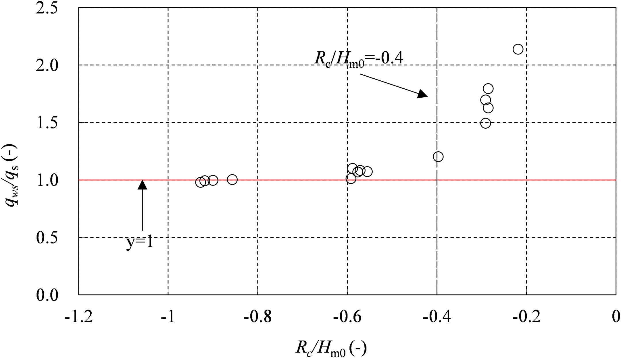 As shown in Figure 5, the data points from the tests were consistent with the calculation results of the formula of EurOtop (2017) in cases of very low absolute values of negative relative freeboard (−0.4 ≤ Rc/Hm0< 0) and showed good fit with the formula of Hughes and Nadal (2009) in cases of higher absolute values of negative relative freeboard (Rc/Hm0< −0.4). However, all of the data points from the tests were smaller than those of the method of Reeve et al. (2008).