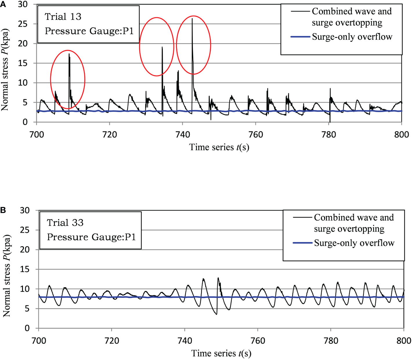 The time series of normal stress measured using a pressure gauge was used to analyze the characteristics of normal stress along the dike. Figure 7 gives two examples of the time series of normal stress measured by pressure gauge P1 on the front of the dike crest from trial 13 (Rc = −0.3 m, Hm0 = 1.03 m, Tp = 6.32 s) and trial 33 (Rc = −0.9 m, Hm0 = 0.97 m, Tp = 6.32 s). The values have been converted to the prototype scale according to a length scale of 10. Figure 7A displays the sharp increase of the normal stress at about 709, 734, and 742 s (as circled in Figure 8A), and much greater than that induced by the surge-only overflow (blue line). The sharp increase of normal stress (referred to as abrupt change) indicates that the dike withstands an impulsive downward-flushing flow directly. As shown in Figure 7B, the normal stress increased slowly (referred to as gradual change), which is the order of the static pressure due to the wave elevation. As Pan et al. (2015) pointed out, breaking passing (plunging breaks on the crest or the landward slope) and smooth passing (waves passing without a breaker) of waves are the two passing patterns in the combination of wave and surge. In cases of lower absolute values of negative freeboard (Rc = −0.3 m), the main wave passing pattern is breaking passing, with the downward-flushing flow directly impacting the dike crest and the upper part of the landward slope and the normal stress characterized by abrupt change. In cases of medium absolute values of negative freeboard (Rc = −0.6m), both wave passing patterns are possible, with the downward-flushing flow mainly impacting the upper part of the landward slope, the normal stress on the dike crest characterized by gradual change, and the normal stress on the upper part of the landward slope characterized by abrupt change. In cases of higher absolute values of negative freeboard (Rc = −0.9m), the main wave passing pattern was smooth passing, and the normal stress on the dike was characterized by gradual change.