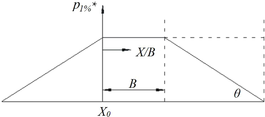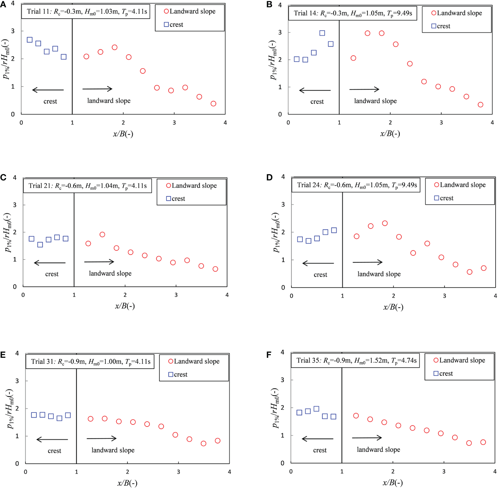Figure 8 shows six examples of the spatial distribution of 1% relative normal stress, p1%* (since the number of waves in this test was about 140, 1% normal stress can be regarded as the maximum value), along the dike with different values of freeboard (Rc), wave height (Hm0), and wave period (Tp). The dimensionless parameter 1% relative normal stress, p1%* (p1% denotes that the normal stress level exceeds by 1% of the measured normal stress time series), in this figure is defined as p1%* = p1%/γHm0, where γ is the water-specific weight, B is the width of the dike crest, and x is the projection length of the measuring point on the horizontal line (see Figure 9).