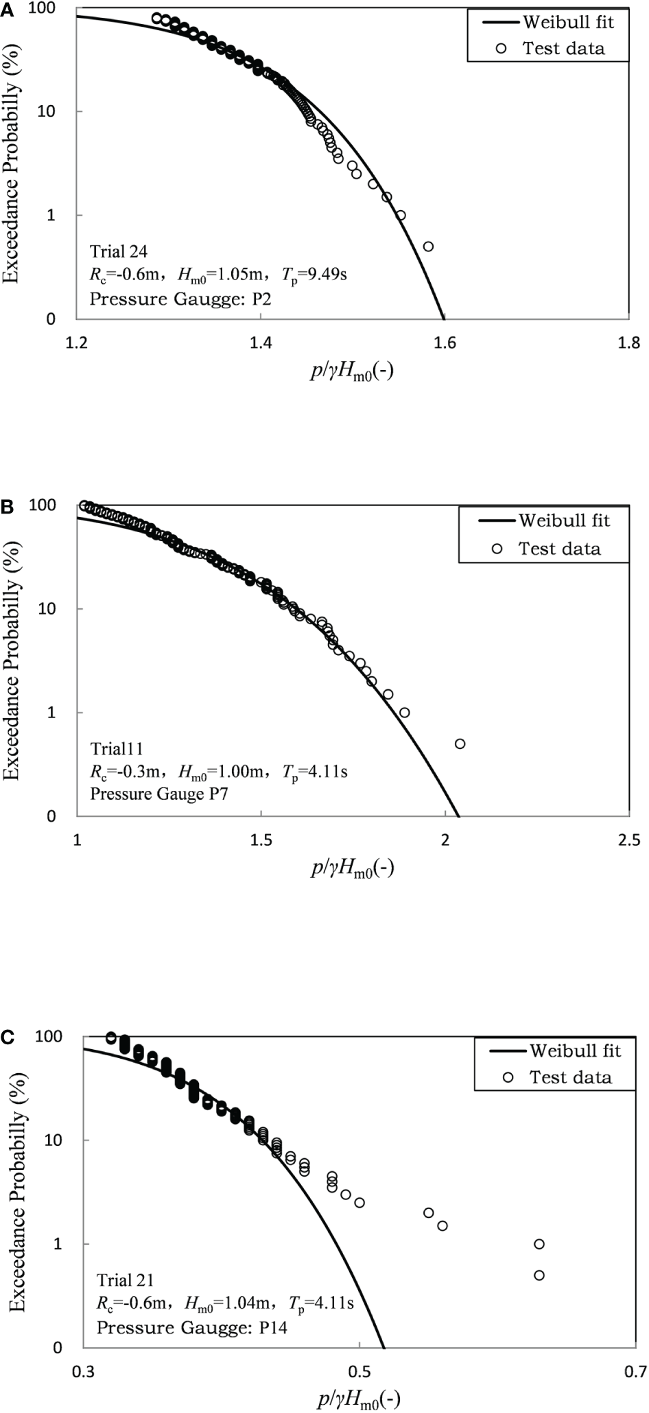 The two-parameter Weibull distribution shown by Eq. 8 was used to represent the statistical distribution of the peak normal stress. Equations 9, 11 described the calculations used to estimate the scale factor apc and the shape factor bpc on the part of the dike crest. On the other hand, the calculations given in Eqs. 10, 12 were used to estimate the scale factor aps and the shape factor bps on the upper part of the landward slope. The maximum normal stress can be estimated using the calculated Weibull factors ap and bp. The calculated maximum normal stress on the dike crest fitted the measurements well, while that on the upper part of the landward slope was mediocre, but was acceptable.
