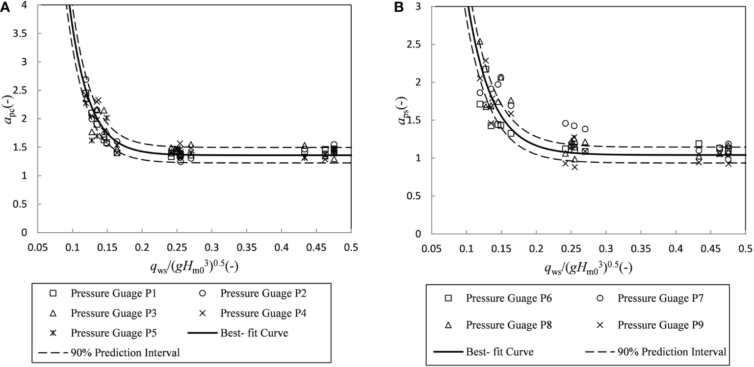 It can be seen from Figure 12B that the shape factor bps on the upper part of the landward slope increased with increasing qws/3)0.5. A comparison of pressure gauges P6–P9 indicated that the values of bps were nearly the same at these pressure gauges during each test case. The solid line is the best-fit empirical equation for the datasets given by the following equation: