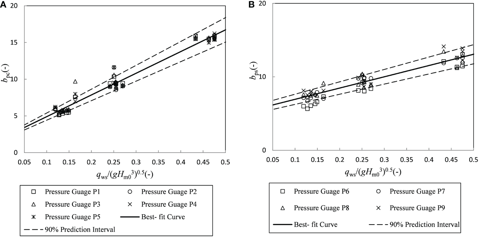 Figure 12 plots the shape factors bpc on the dike crest and bps on the upper part of the landward slope versus the dimensionless overtopping discharge [qws/0.5].It can be seen from Figure 12A that the shape factor bpc on the dike crest increased with increasing qws/0.5. A comparison of pressure gauges P1–P5 indicated that the values of bpc were nearly the same at these pressure gauges during each test. One data point at pressure gauge P3 from trial 25 tended to be greater than the average trend. Such deviation might be due to the Hm0 (Hm0 = 1.51m) being relatively large in this test case. The solid line is the best-fit empirical equation for the datasets given by the following equation: