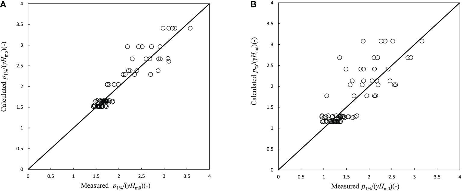 where N is the peak normal stress number. From Eqs. 9–12, the scale factor ap and the shape factor bp were calculated for all test cases. Then, Eq. 13 was used to estimate the maximum normal stress. Comparisons between the estimated and measured values for the maximum normal stress on the dike crest and upper part of the landward slope are shown in Figure 13. A better prediction can be found for the maximum normal stress on the dike crest, as shown in Figure 13A. The estimation of maximum normal stress on the upper part of the landward slope was mediocre, but reasonable, as shown in Figure 13B. The data showed a good trend, but the data points were scattered because of the limited wave numbers and the randomness of the maximum value in limited cases.