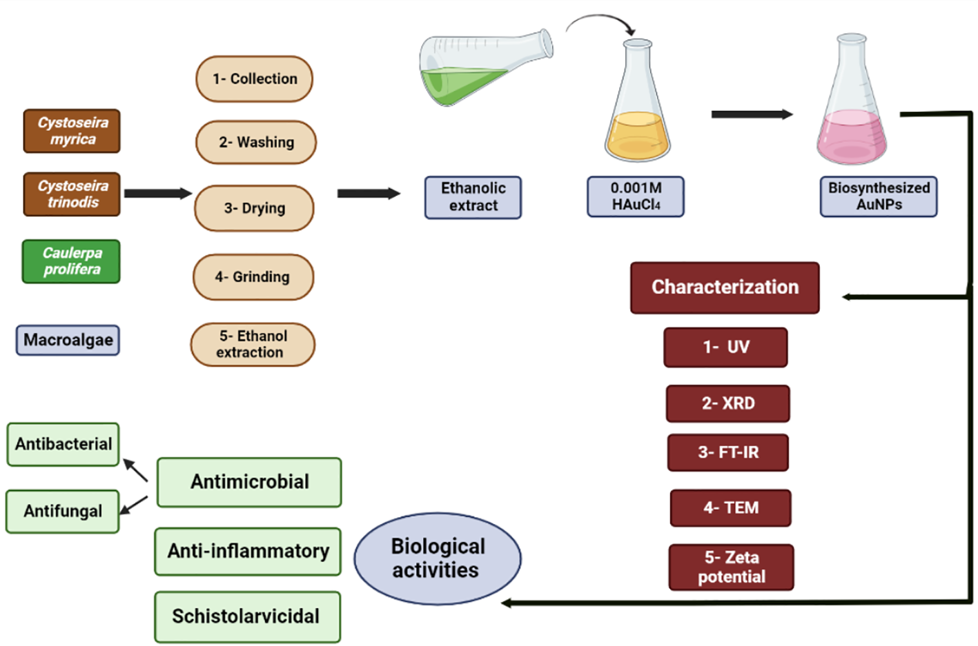 In the current study, Au-NPs were biosynthesized using the ethanolic extracts of three macroalgae, brown macroalgae C. myrica, C. trinodis, and green macroalgae C. prolifera collected from Red Sea, Egypt, and investigated their biological activities such as antimicrobial (antibacterial and antifungal), anti-inflammatory, and schistolarvicidal activities.
