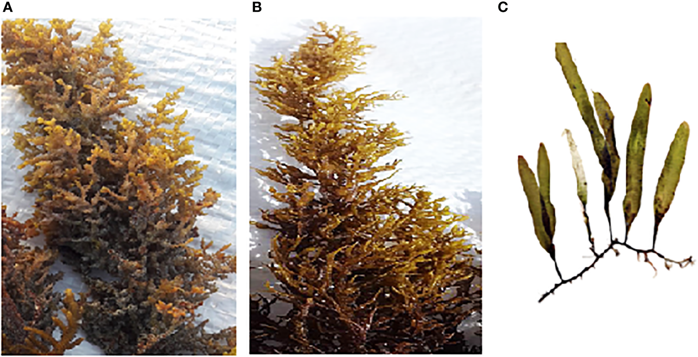Macroalgal species used for the biosynthesis of Au-NPs (A)Cystoseira myrica, (B)Cystoseira trinodis, and (C)Caulerpa prolifera.