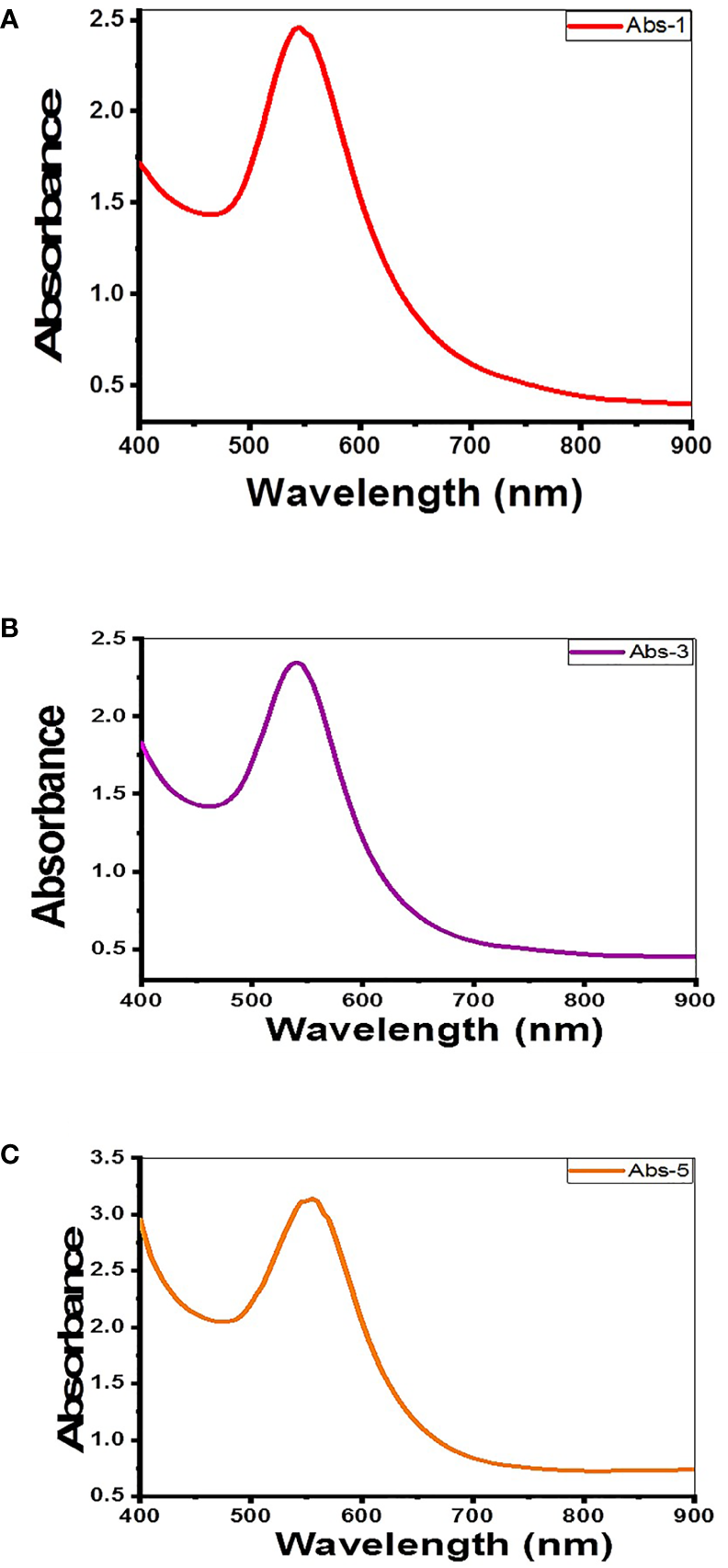 The complete reduction of Au+3 to Au0 and the formation of Au-NPs were verified by the change in the color of the solution mixture from pale yellow (the color of chloroauric acid and the macroalgal extract) to a ruby-red or pinkish color that is a characteristic of Au-NPs (Ramakrishna et al., 2016), followed by UV–Vis spectrophotometer analysis. The formation of Au-NPs was indicated by the dominant single-surface plasmon resonance (SPR) peak at 545, 540, and 555 nm of macroalgae C. myrica, C. trinodis, and C. prolifera, respectively, in the UV–visible spectra as shown in Figures 3A–C.
