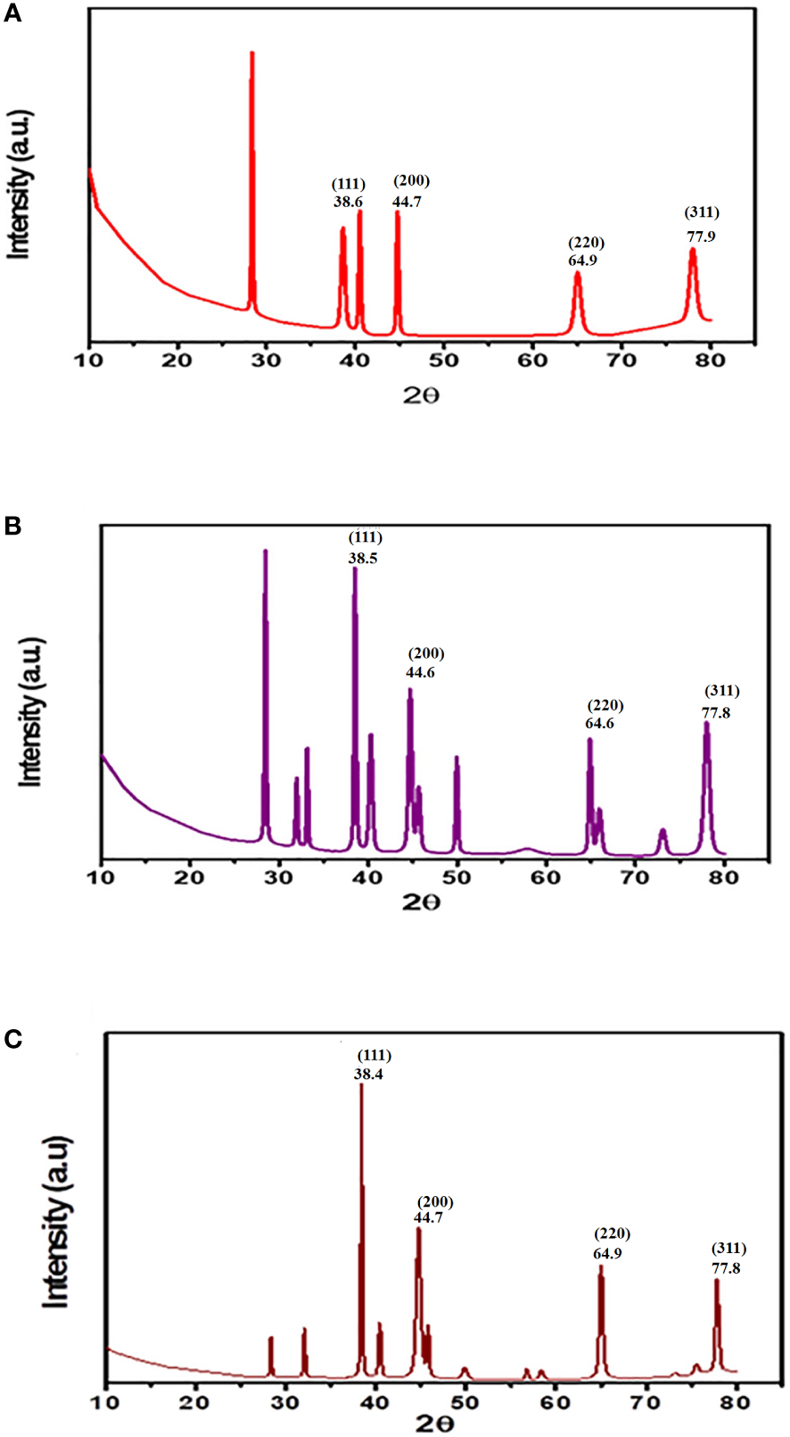 XRD pattern of Au-NPs biosynthesized using the ethanolic extracts of macroalgae (A)C. myrica(B)C. trinodis, and (C)C. prolifera.