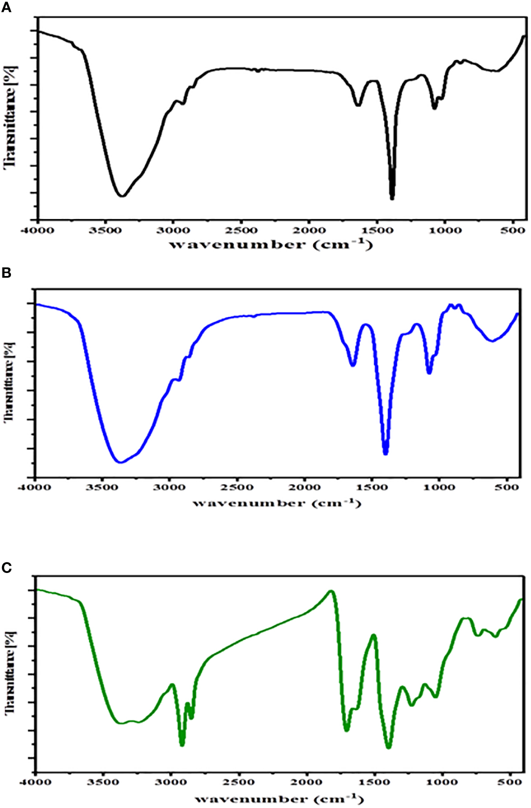 FT-IR spectrum of Au-NPs biosynthesized using ethanolic extracts of macroalgae (A)C. myrica, (B)C. trinodis, and (C)C. prolifera.