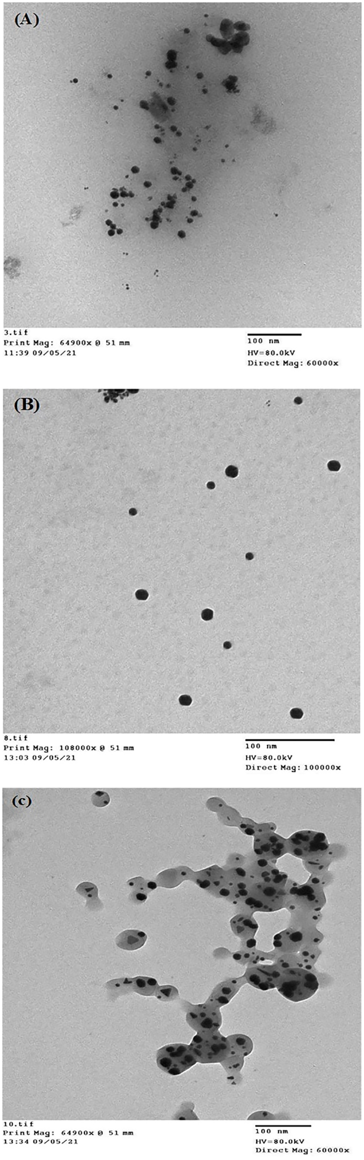 The morphological analysis of the NPs was done with transmission electron microscopy (TEM). For TEM analysis, a drop of the Au-NP solution was placed on the carbon-coated copper grids, letting the water evaporate till dry at room temperature. Electron micrographs were obtained using a JEOL-1010 transmission electron microscope at 80 kV at the Regional Center for Mycology and Biotechnology (RCMB), Al-Azhar University, Egypt (Amin et al., 2021).