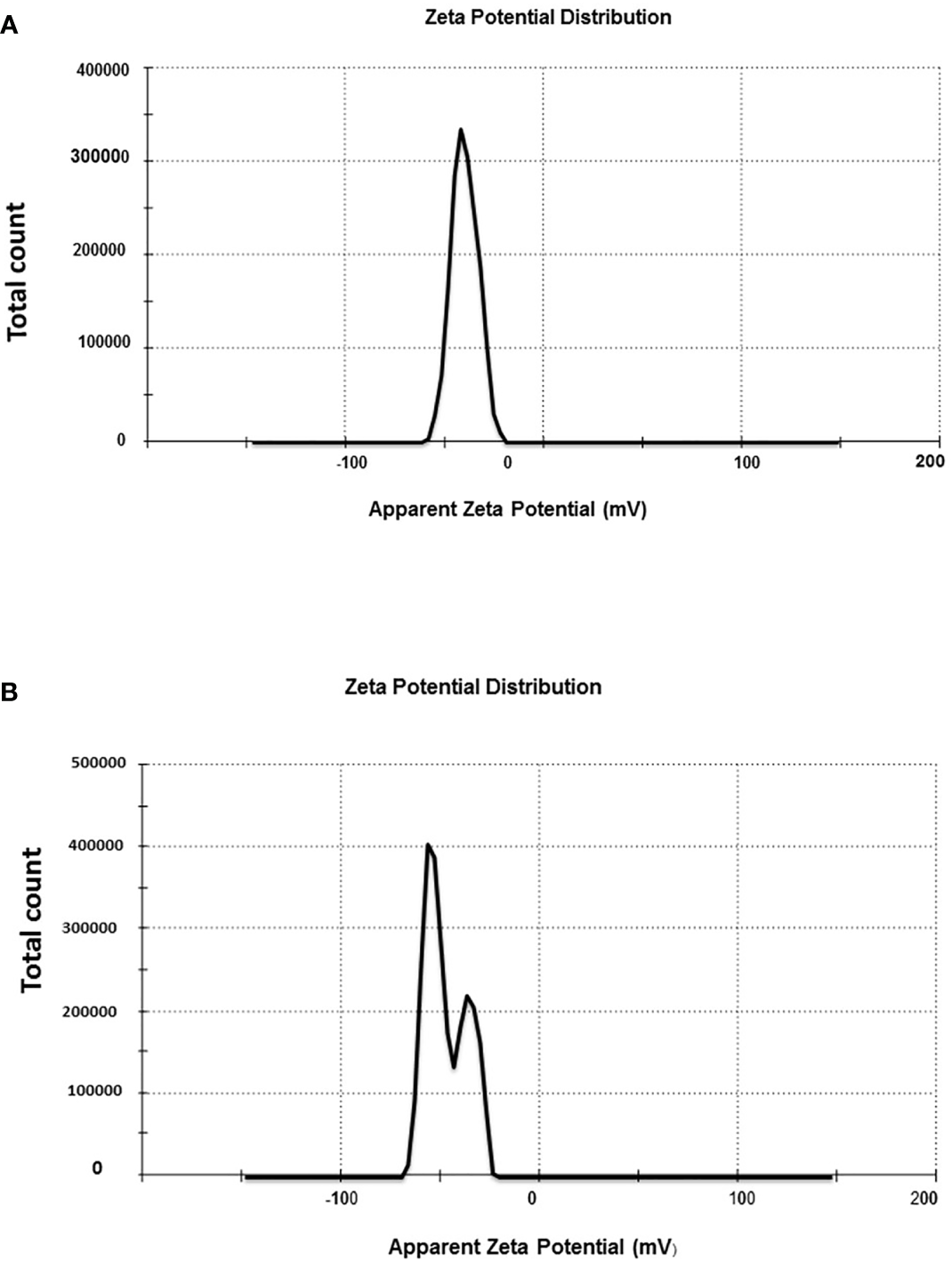 Zeta potential distribution of Au-NPs biosynthesized using the extracts of macroalgae (A)C. trinodis and (B)C. prolifera.