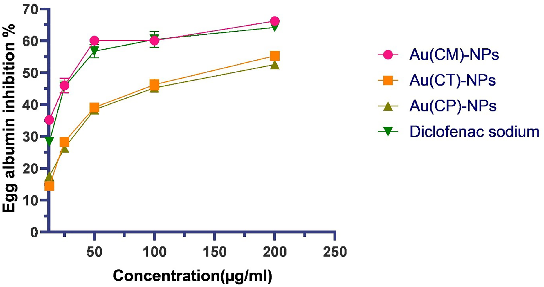 The in vitro anti-inflammatory activity of macroalgae-based Au-NPs was studied using the inhibition of egg albumin denaturation. The denaturation of cellular proteins is a well-documented cause of inflammatory reactions. The current macroalgae-based Au-NPs have exhibited good inhibitory potential on protein denaturation, which can be explained by their ability to stabilize the tertiary and quaternary structure of proteins. These findings are similar to Azeem et al. (2022) and more ameliorated than those of Mani et al. (2015) and Prabakaran and Mani (2019).