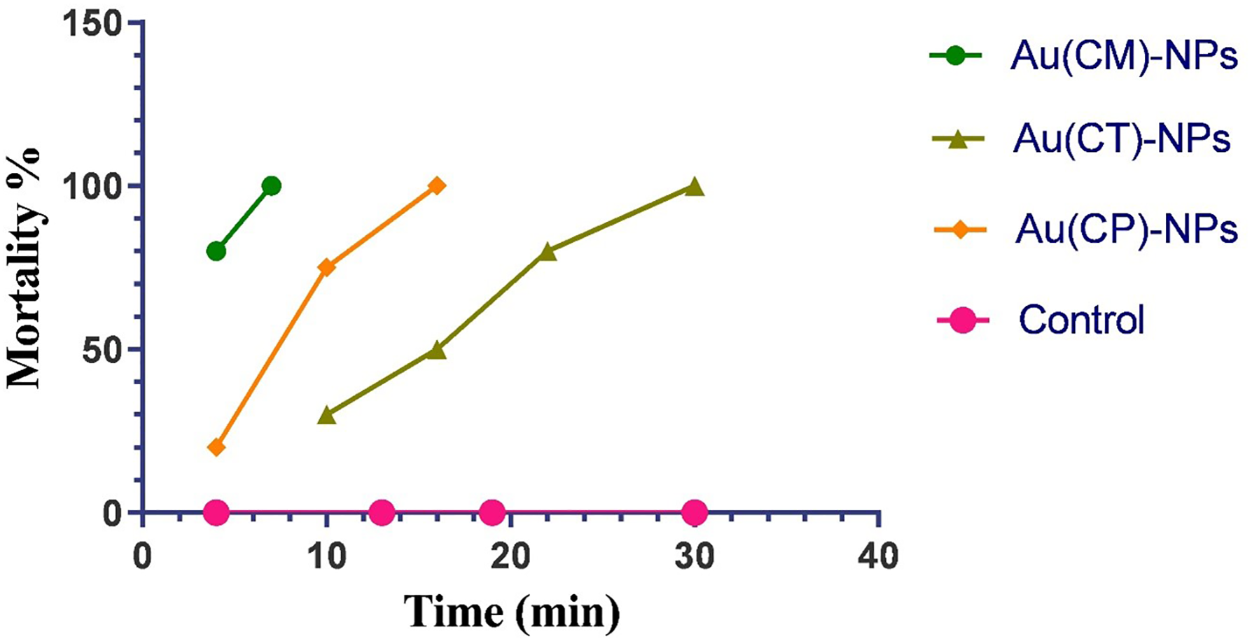 The toxic effect of macroalgae-based Au-NPs (Au (CM)-NPs, Au (CP)-NPs, and Au (CT)-NPs) was evaluated against the larval stage of S. mansoni (cercariae). Au(CM)-NPs exhibit the most potent cercaricidal activity as 7 min was enough to kill all exposed cercariae (100% mortality) compared to 0% of the deaths in the control group (Figure 10), followed by Au(CP)-NPs as it achieved 100% mortality after 16 min, while Au(CT)-NPs showed the lowest biocidal effect (100% mortality after 30 min).