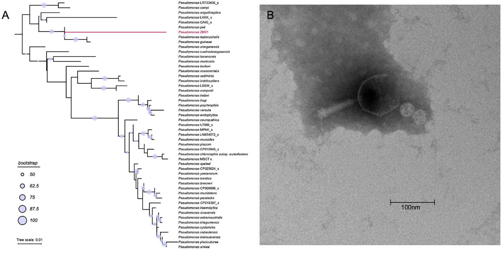 (A) The phylogenic tree based on the 16S rRNA gene of Pseudomonas ZM01 and other 120 reference 16S rRNA gene sequences of Pseudomonas ZM01. (B) Transmission electron micrograph of vB_PaeM_M1.