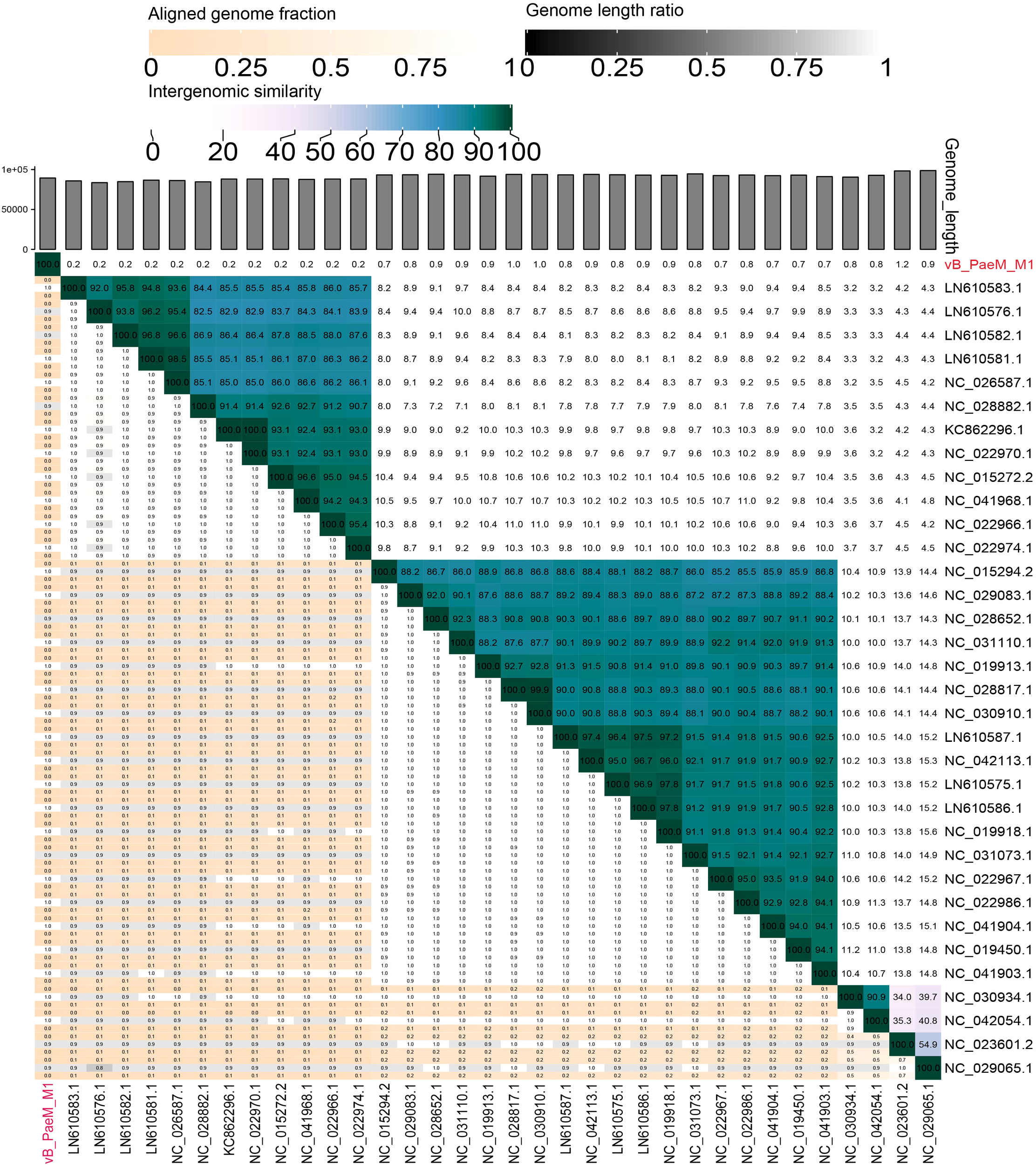 Shared gene heat map of vB_PaeM_M1 and vB_PaeM_M1 like virus in rectangular phylogenetic tree. In the right half, color coding allows rapid visualization of phage genome clustering based on intergenic similarity: the closer the relationship between genomes, the darker the color. These numbers represent the similarity values of each genome pair. In the left half, the three indicator values of each genome pair are expressed in order from top to bottom: aligned partial genome 1 (for the genome found in this row), genome length ratio (for two genomes in this pair), and aligned partial genome 2 (for the genome found in this column). Darker colors emphasize lower values, indicating that there is only a small number of genome aligned genome pairs (orange to white gradient), or there is a large difference in the length of the two genomes (black to white gradient). As the distance between phages increases, the aligned genomic fragments are expected to decrease.