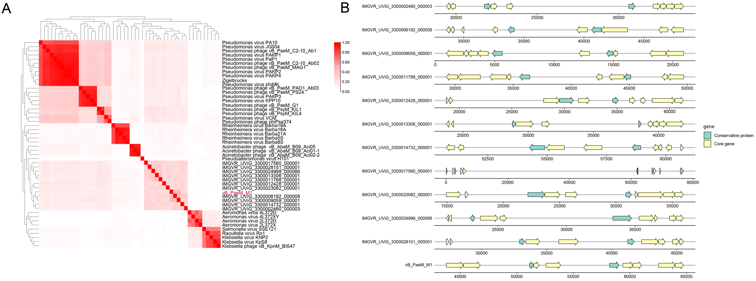 (A) Heat map of gene sharing rate between vB_PaeM_M1 and other phages. The sharing rate is displayed by color depth. (B) The gene map of VC_61. Core genomes are represented by yellow arrows and the conservative protein are represented by green arrows.