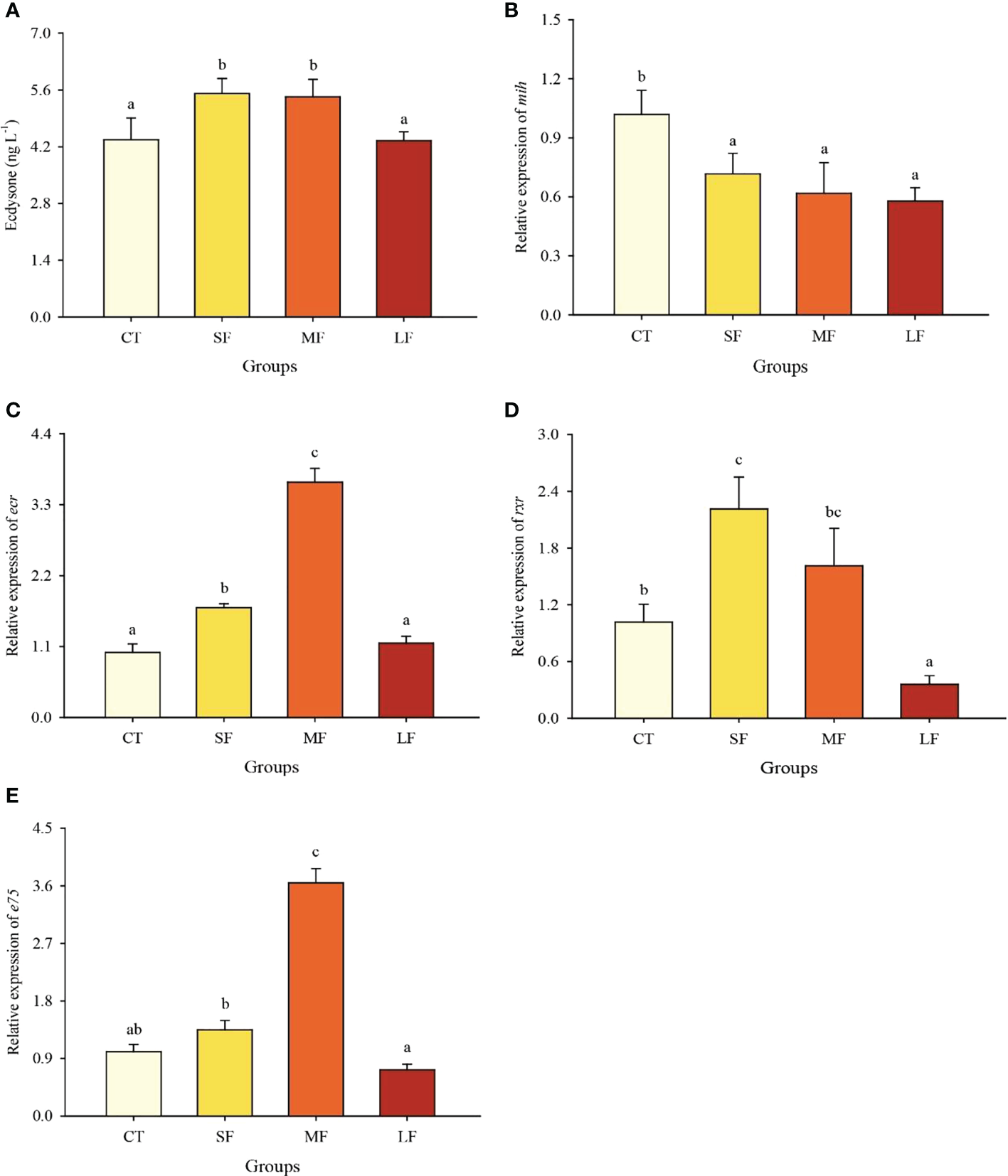 The levels of ecdysone were significantly higher in the SF and MF groups than in the CT and LF groups (P< 0.05) (Figure 2A). The expression of mih gene was significantly higher in the CT group than in all other groups (P< 0.05) (Figure 2B). The relative expression of ecr and e75 genes was significantly higher in the MF group than in all other groups (P< 0.05) (Figures 2C, E). There was no significant difference in the relative expression of rxr gene between SF and MF groups (P > 0.05), and LF group was significantly lower than the other three groups (P > 0.05) (Figure 2D).