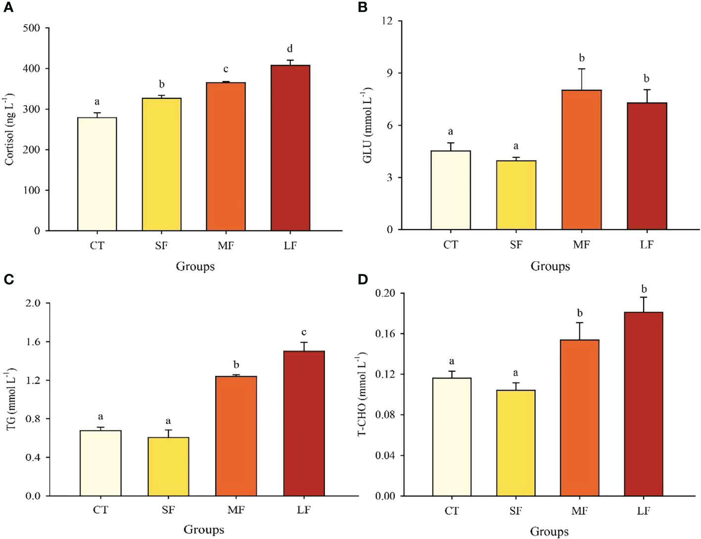 The level of cortisol in hemolymph tended to increase significantly with the exacerbation of DTF (P< 0.05) (Figure 3A). There was no significant difference in GLU levels between the MF (8.02 ± 1.24 mmol L-1) and LF (7.29 ± 0.76 mmol L-1) groups (P > 0.05), but both were significantly higher than the CT (4.52 ± 0.47 mmol L-1) and SF groups (3.95 ± 0.20 mmol L-1) (P< 0.05) (Figure 3B). T-CHO and TG levels showed a significant increase in both MF and LF compared to the CT and SF groups (P< 0.05) (Figures 3C, D).