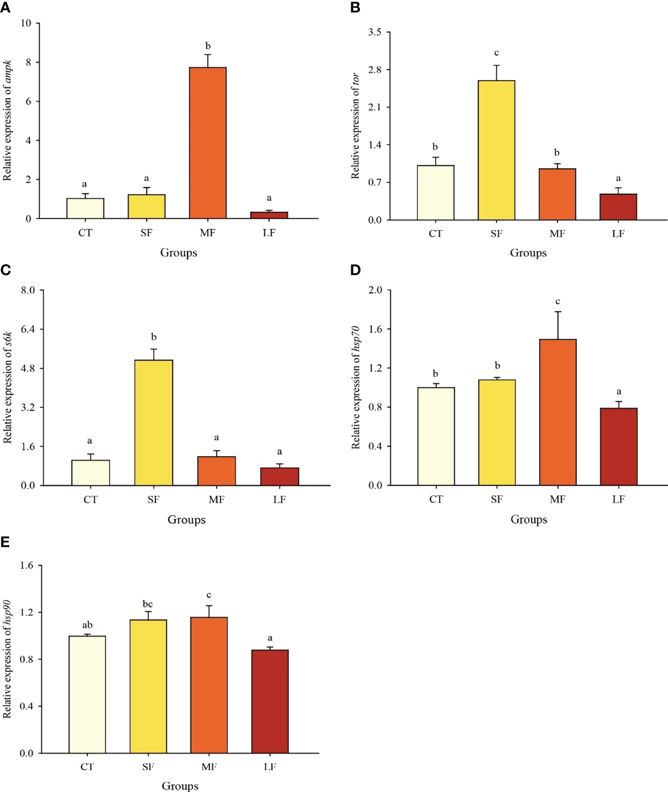 Relative expression of ampk(A), tor(B), s6k(C), hsp70(D) and hsp90(E) in the hepatopancreas of juvenile crabs. Values are expressed as mean ± SD (n = 3). Different superscripts indicate significant differences between treatments (P< 0.05).
