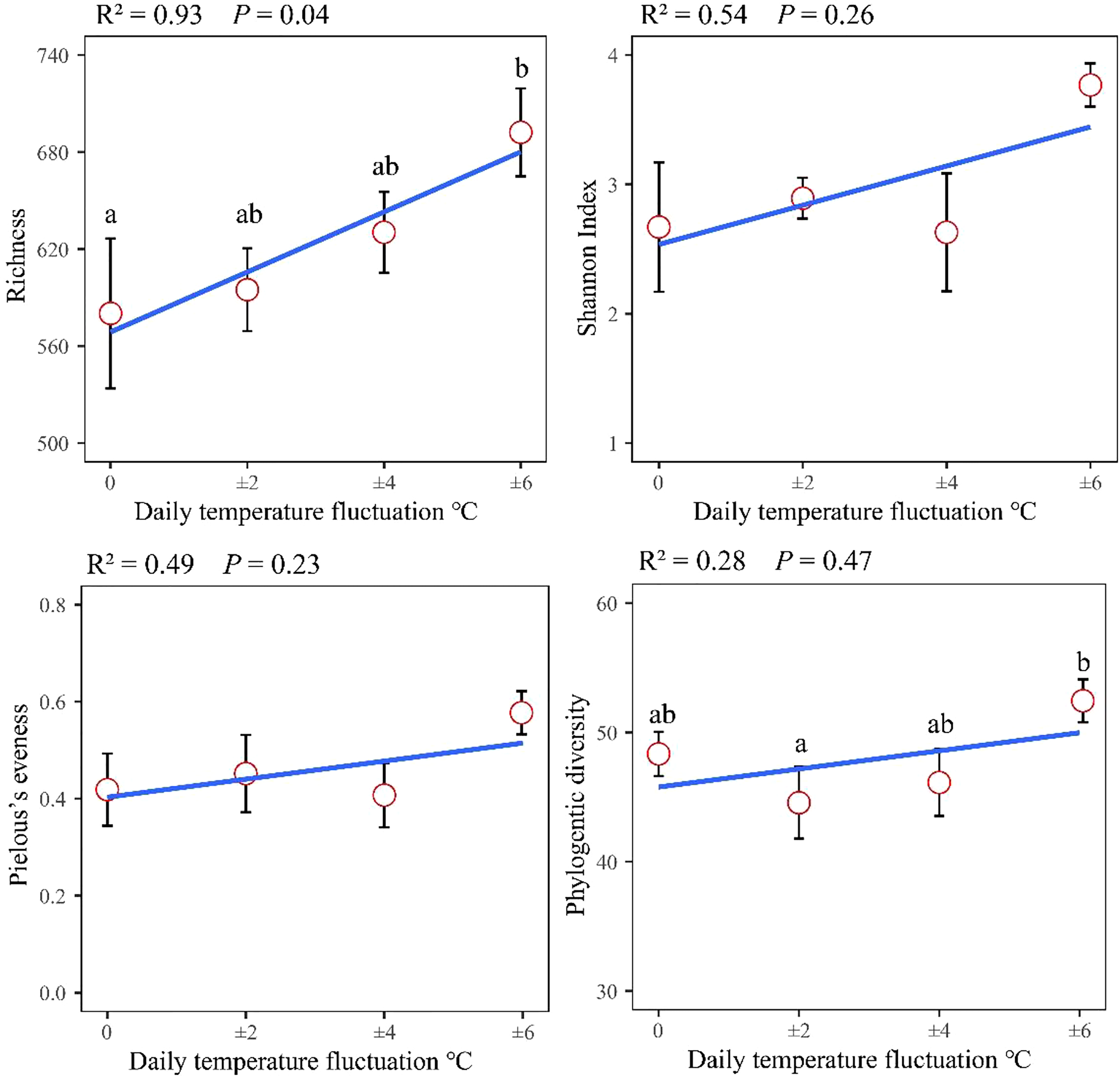 α-diversity index in gut microbes of juvenile crabs. Values are expressed as mean ± SD (n = 3). Different superscripts indicate significant differences between treatments (P< 0.05). R2 and P values after linear regression analysis showed the correlation between α-diversity indices and DTF.