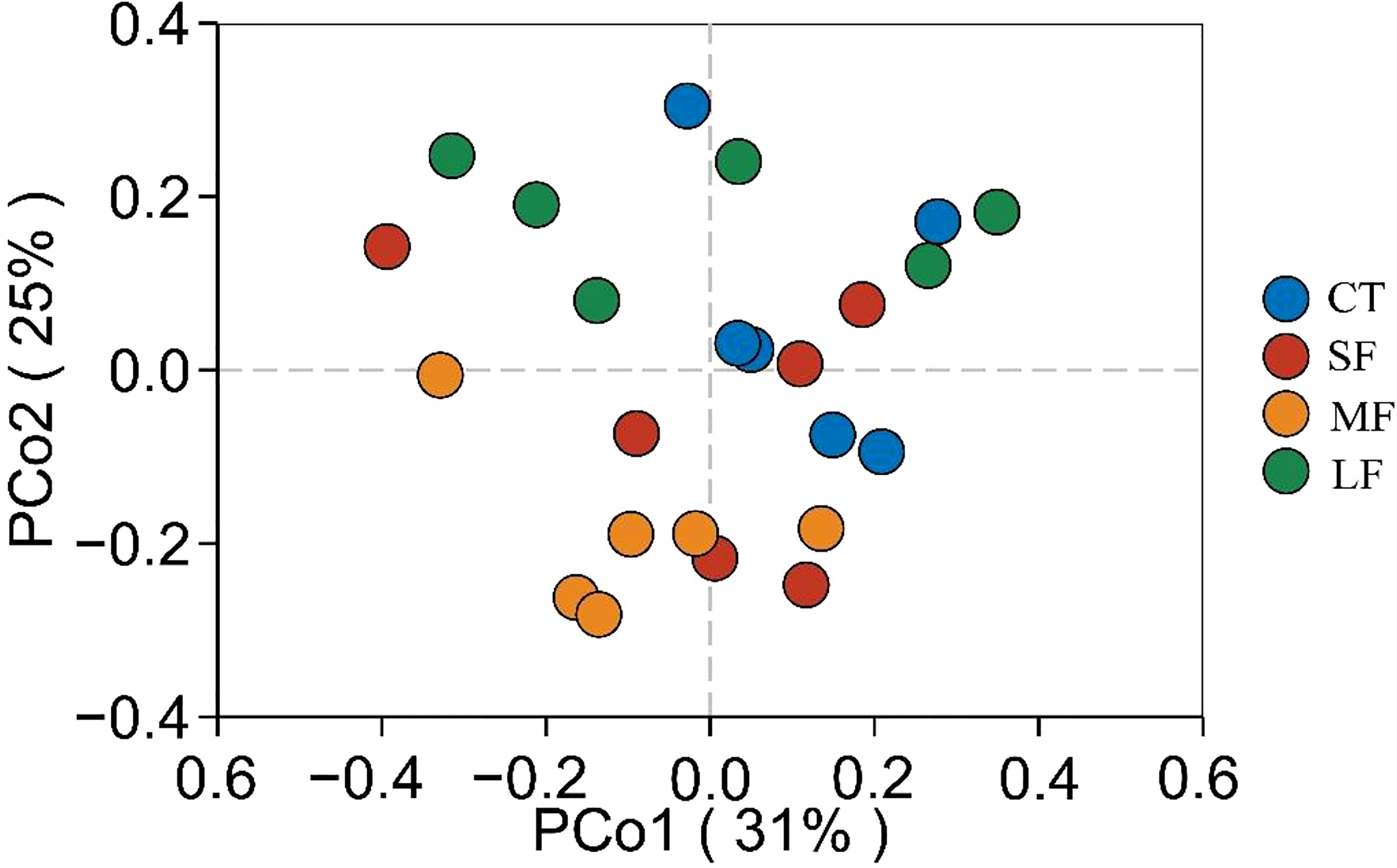 Principal coordinate analysis (PCoA) plots of the gut microbial community of juvenile crabs at different levels of DTF (28°C, 28 ± 2°C, 28 ± 4°C, 28 ± 6°C).
