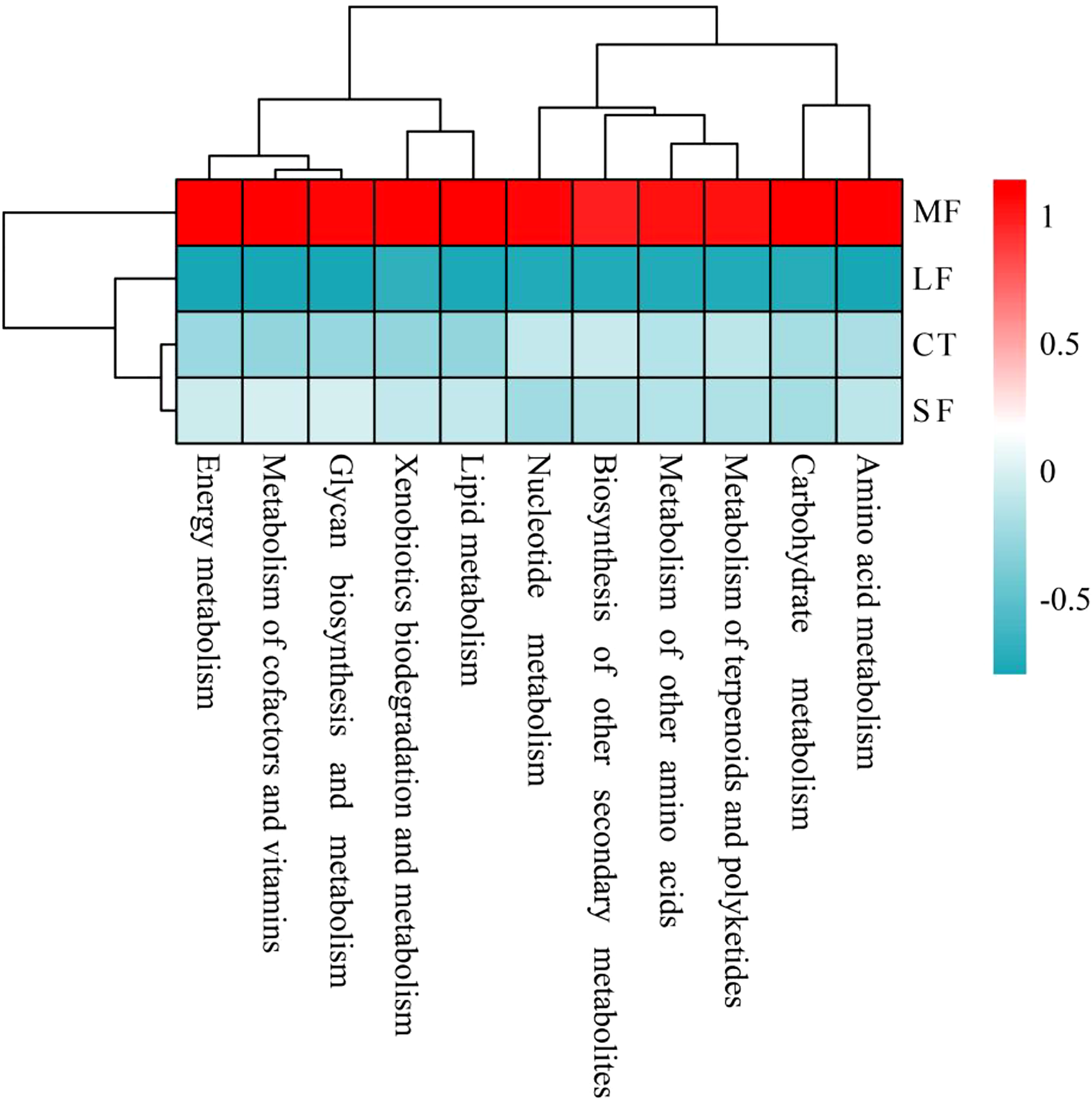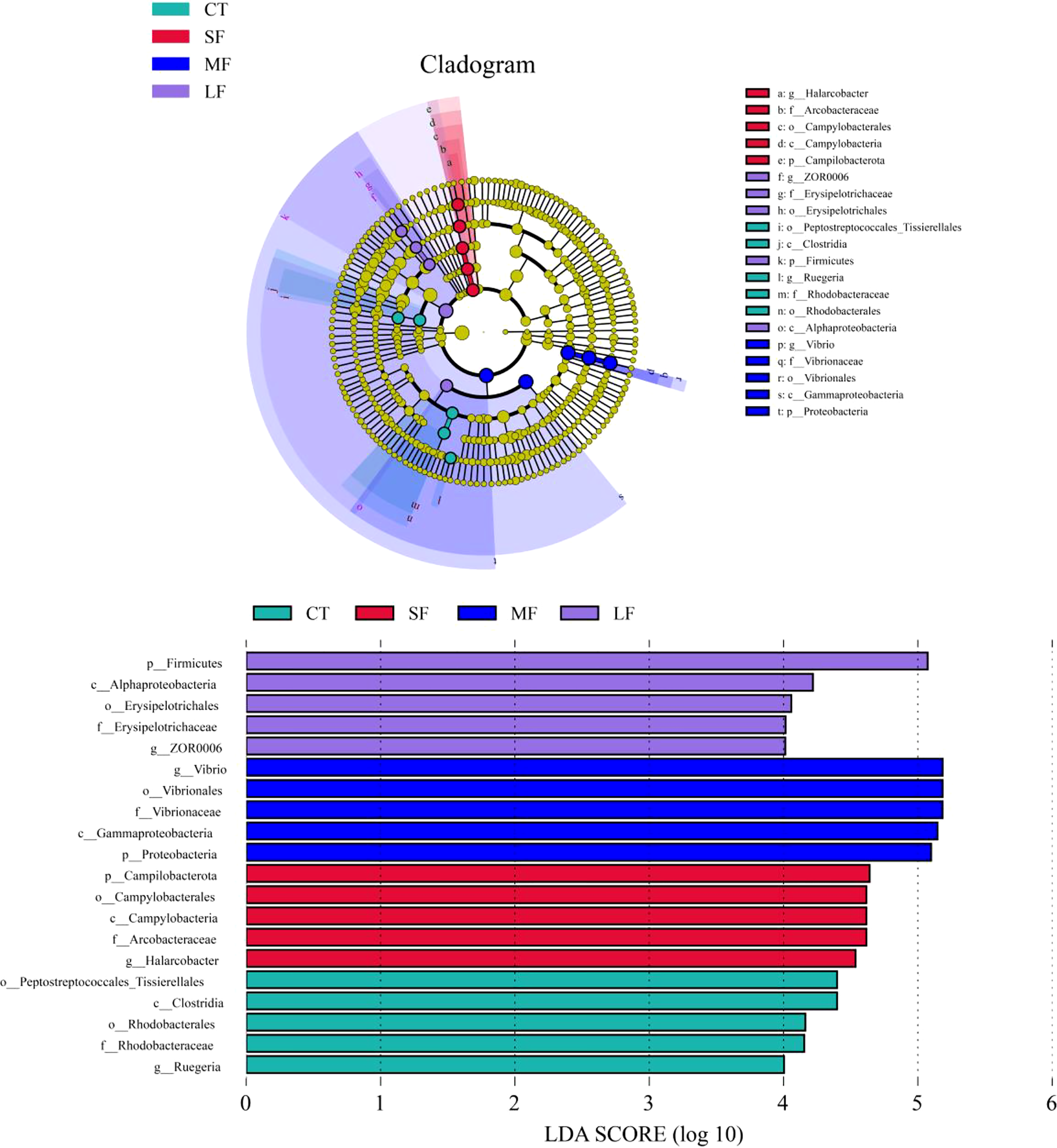 Regression analysis of the alpha-diversity indices found that Richness, Shannon index, Pielous’s eveness and Phylogentic diversity showed an increasing trend with the drastic degree of DTF (Figure 6). A comparison of the Principal Coordinate Analysis (PCoA) method based on the Bray_curtis distance algorithm revealed that CT, SF, MF and LF showed significant clustering (Figure 7). The ANOSIM analysis showed significant differences in bacterial community structure between the four groups (R=0.327, P=0.001) (Table 2). There were no significant differences (P > 0.05) between the CT and SF groups and between the CT and LF groups. The rest of the groups were significantly different from each other (P< 0.05). Relative community abundance at the phylum level (Figure 8A) indicates that nine known phyla were identified, and sequences from any known phylum that could not be classified were classified as “other”. Of these, Firmicutes and Proteobacteria predominate in the gut of juvenile crab. Campilobacterota accounted for a significantly higher proportion in the SF group (8.35 ± 4.22%) than in CT (0.11 ± 0.06%), MF (0.62 ± 0.43%) and LF (0.70 ± 0.60%) (P< 0.05). The first nine dominant genera were selected to compare the abundance of communities between groups at the genus level (Figure 8B), and sequences of any known genera that could not be classified were classified as “other”. The main genera in the CT, SF, MF and LF groups were Vibrio (25.76 ± 11.05%, 36.05 ± 12.32%, 52.79 ± 6.63%, 21.77 ± 5.41%), Streptococcus (0.57 ± 0.51%, 0.54 ± 0.52%, 0.94 ± 0.78%, 2.36 ± 1.39%), Pseudoalteromonas (6.43 ± 5.12%, 3.43 ± 1.25%, 2.04 ± 0.21%, 4.12 ± 1.94%), Mycoplasmataceae_uncultured (34.60 ± 8.24%, 21.46 ± 2.70%, 16.25 ± 10.40%, 27.75 ± 12.86%), Lactococcus (1.32 ± 1.73%, 0.63 ± 0.81%, 0.63 ± 0.56%, 2.06 ± 1.86%), Fusibacter (4.45 ± 4.59%, 0.27 ± 0.13%, 0.07 ± 0.04%, 0.54 ± 0.63%), Exiguobacterium (2.03 ± 2.21%, 5.80 ± 7.77%, 5.07 ± 4.93%, 7.87 ± 3.22%), Carnobacterium (3.15 ± 2.17%, 1.46 ± 0.98%, 2.22 ± 1.34%, 3.60 ± 3.03%) found that the abundance of Vibrio tended to increase and then decrease with the intensification of DTF. According to the set screening criteria (LDA > 4), LEfSe showed that five biomarkers were significantly more abundant in relative abundance in each of the CT, SF, MF, and LF groups (Figure 9). Among them, Rhodobacterales and Rhodobacterac were significantly more abundant in the CT group, Campylobacterales in the SF group, while Vibrionales in the MF group and erysipelotrichales in the LF group. Metabolic functions were compared between all groups in a 2-level KEGG analysis by using clustered heat map analysis. Pathways related to amino acid metabolism, carbohydrate metabolism, metabolism of terpenoids and polyketides, metabolism of other amino acids, biosynthesis of other secondary metabolites, nucleotide metabolism, lipid metabolism, xenobiotics biodegradation and metabolism, glycan biosynthesis and metabolism, metabolism of cofactors and vitamins, and energy metabolism were relatively abundant in the MF group (Figure 10). The microbial network structure of each group was different (Figure 11). The intestinal microbiota network of juvenile crabs in the SF group consisted of 155 nodes and 1179 edges and had the highest microbial network complexity. Compared with the other groups, the SF group had a higher average degree, average path length, and clustering coefficient (Table 3).