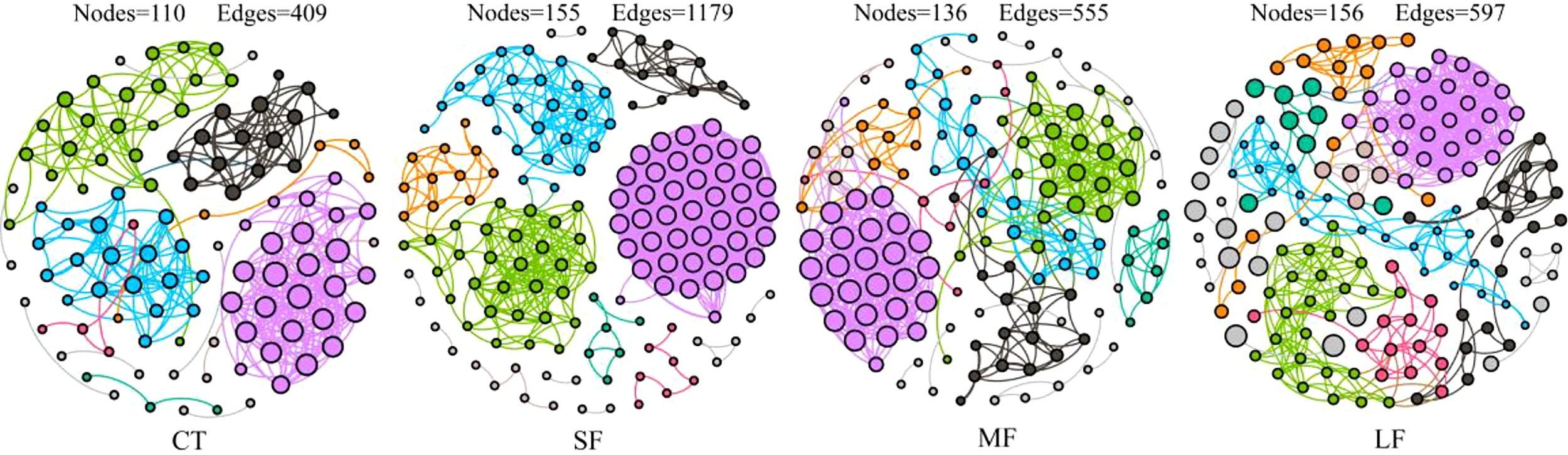 A network of relationships between gut microbial taxa of juvenile crabs at different levels of DTF (28°C, 28 ± 2°C, 28 ± 4°C, 28 ± 6°C). The size of the nodes indicates the relative abundance of OTUs, and the nodes are coloured by different modules.