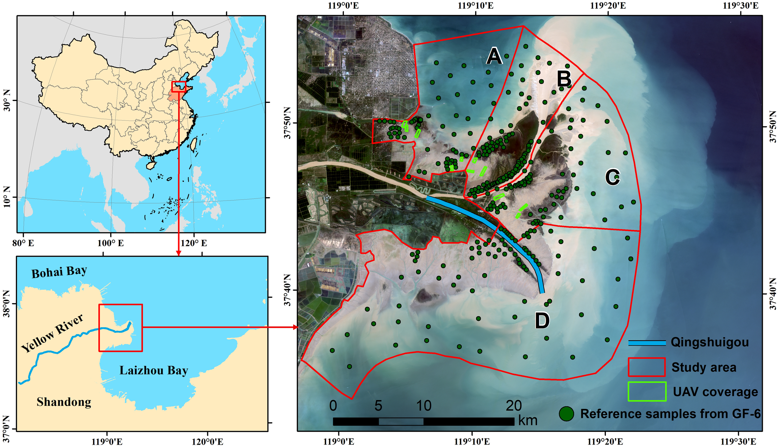 The study area is in the Yellow River Delta National Nature Reserve, which is located in the northeast of Dongying City, Shandong Province, China (118°32’58’’E-119°20’27’’E, 37°34’46’’N-38°12’18’’N). It belongs to warm temperate zone and semi-humid continental monsoon climate, with four distinct seasons and rainy summers. The annual average temperature is 11.7-12.6°C, the annual average precipitation is 530-630 mm, and about 70% of the precipitation is concentrated in summer. The study area covers the intertidal zones of the Yellow River Estuary (Figure 1), with an area of 923 km2. P.australis, S.salsa, and S.alterniflora are the primary vegetation species in the study area (Wang et al., 2021b; Zhang et al., 2021). P.australis generally grows on both sides of the river bank; in the inner part of tidal flat, it is mixed with Tamarix Chinensis. P. australis starts to grow in April, flowering from August to September, and start senescence in October. P.australis near the river generally grows better with higher density, while P.australis in the area with higher salinity is relatively short and sparse. S.salsa is an annual herb with strong salt-tolerance. It is mostly found in mid to high tide areas and covers a wide range. It blooms red from July to October. S.alterniflora is a perennial herb native to the Atlantic coast of North America. It was introduced to the Yellow River Estuary in the 1990s. Due to its strong reproductive capacity and environmental adaptability, S.alterniflora has expanded rapidly in the tidal flat area of Yellow River Delta in recent years, resulting in degradation of the native S.salsa and seagrass bed, which has seriously affected the biodiversity in the coastal wetland. The study area was divided into four zones where Zone A and B are located in the north bank of the estuary, and Zone C and D are located in the south bank. Zone B and C are located near the river mouth.