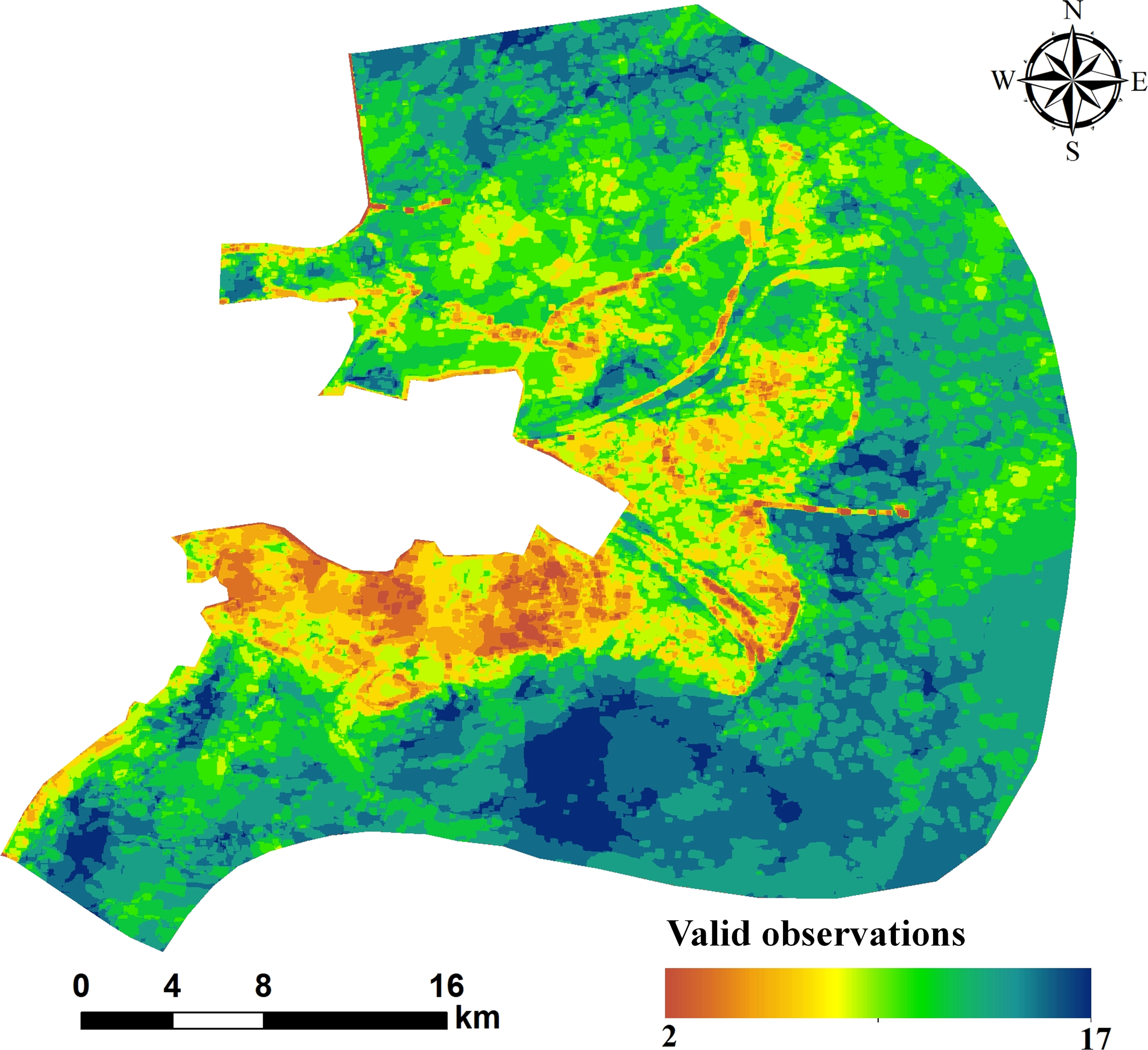 Landsat 8 satellite is a multispectral imaging satellite launched in 2013. Its carries Operational Land Imager (OLI) sensor with 9 spectral bands from visible to shortwave infrared wavelengths. We downloaded all available Landsat 8 Level 2 Tier 1 surface reflectance images covering the study area (Row 121, Path 43) acquired during January 1, 2020 ~ December 31, 2020 from Google Earth Engine (GEE) platform. The quality assessment (QA) bands of the images were used to identify the area covered by clouds and cloud shadows. There were 18 images in total, and the average cloud coverage was 29.2%. Figure 2 illustrates the spatial distribution of the number of valid observations (no cloud/cloud shadow). The average number of valid observations is 12.7 per pixel, while the number was 11.5 per pixel over the intertidal area.