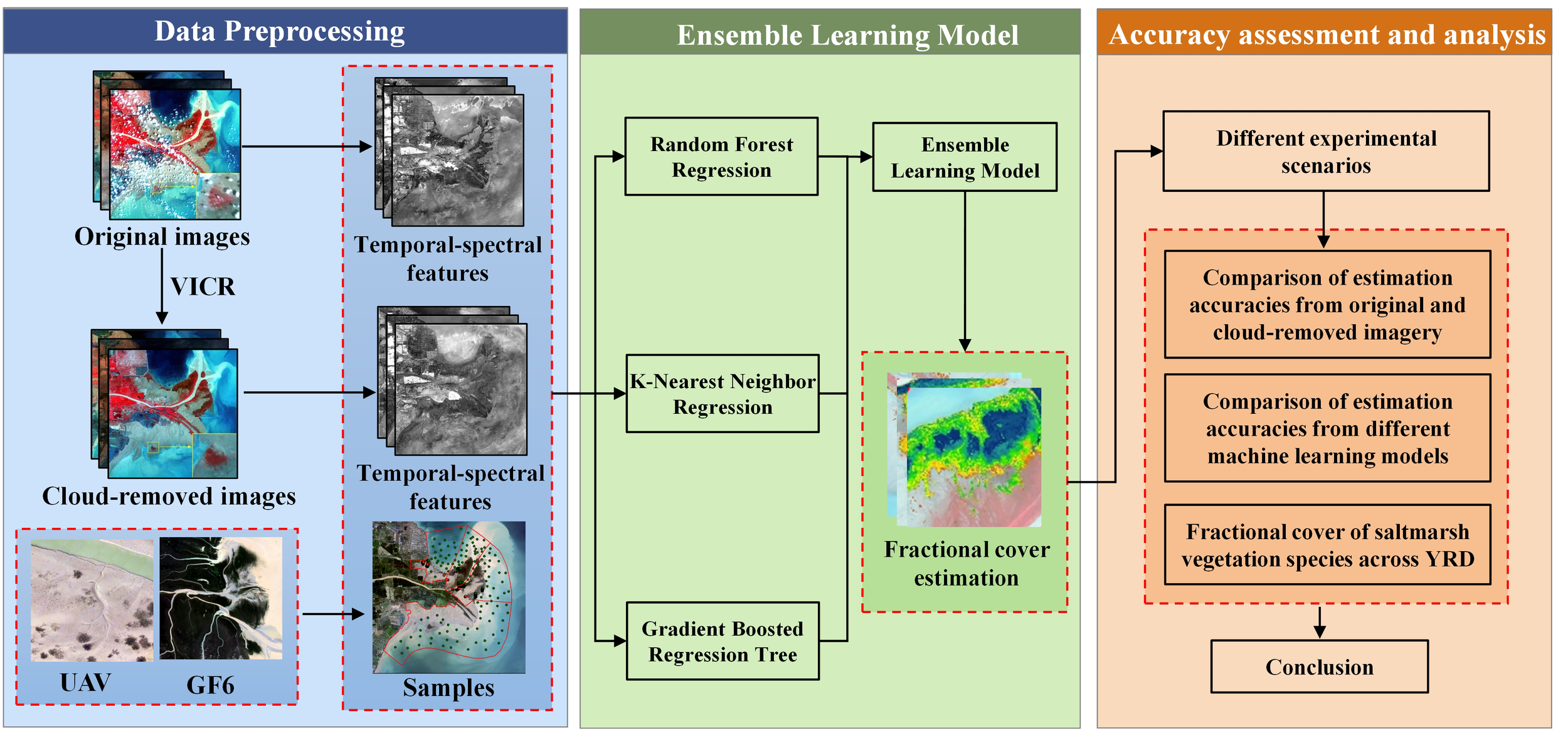 The Yellow River Delta (YRD) is one of the youngest and most extensive coastal wetland systems in the world (Li et al., 2019; Wang et al., 2021b; Zhang et al., 2021). Due to the invasion of Spartina alterniflora in recent years, the habitats of native species Suaeda salsa and Phragmites australis have shrunk, resulting in the reduction of S.salsa cover and the fragmentation of the habitats. In this study, we took the YRD wetland as study area and aimed to (1) present a machine-learning-based ensemble model for species-level vegetation cover estimation, and (2) evaluate the role of cloud-removed time-series images in vegetation cover estimation. We hope that this study will provide a technical framework for fractional cover estimation of saltmarsh species, and help to analyze the ecological security of wetlands, supporting the sustainable development of coastal wetlands.