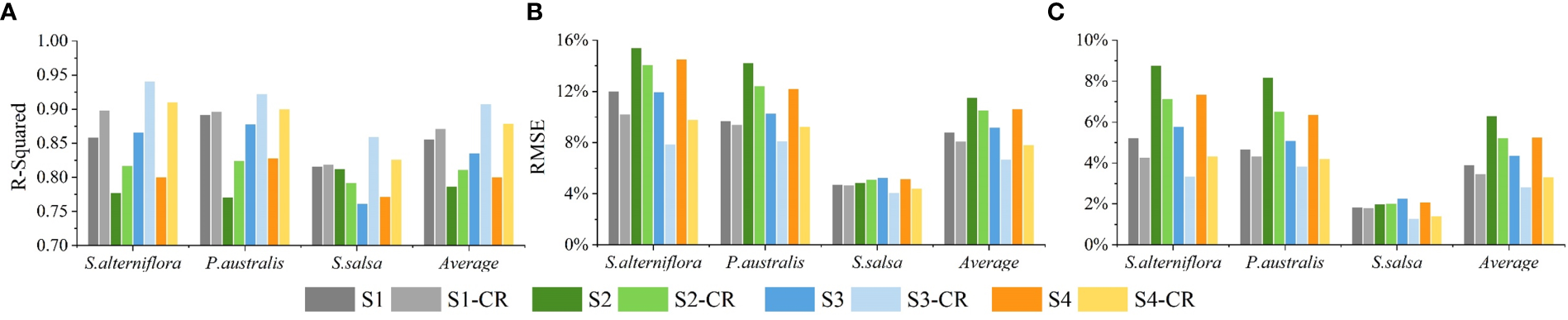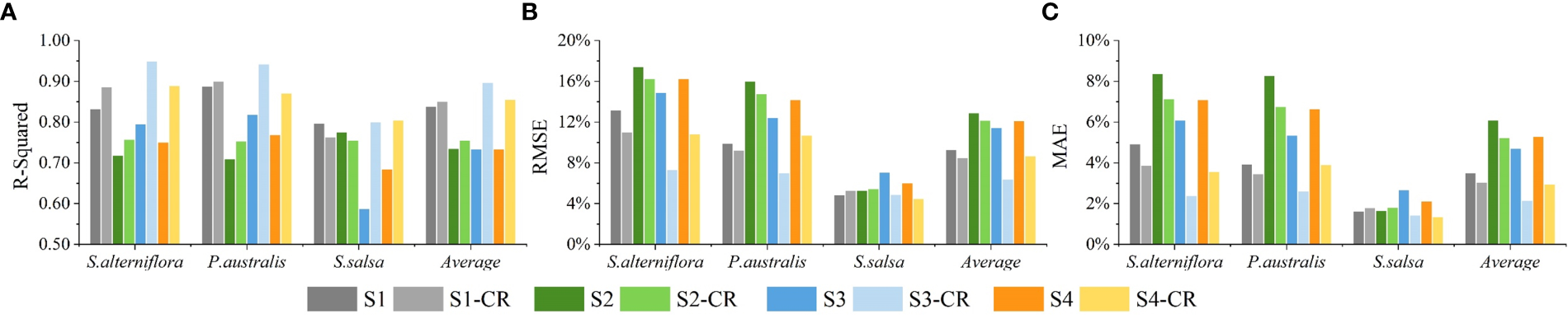 (A) R-square, (B) RMSE and (C) MAE of the fractional cover estimation of different salt marsh vegetation species from four scenarios using Random Forest Regression model. S1~S4: Scenario 1 ~ Scenario 4 based on the original Landsat imagery; S1-CR ~ S4-CR: Scenario 1 ~ Scenario 4 based on the cloud-removed Landsat imagery.