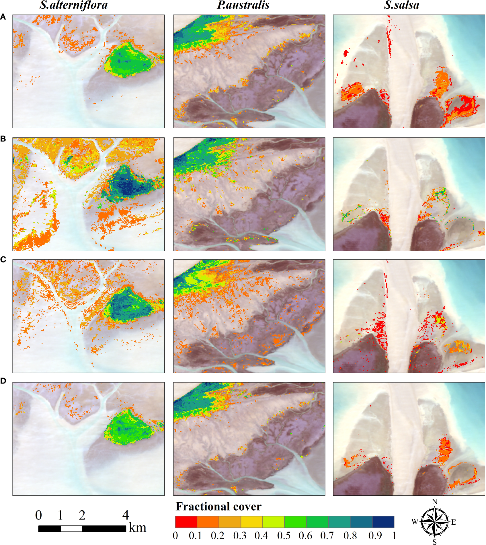 Saltmarshes in coastal wetlands provide significant ecosystem services such as flood protection, erosion control, biodiversity maintenance, carbon sequestration and climate change mitigation (Mojica Vélez et al., 2018; Wang et al., 2021a; Wang et al., 2021b). During the past decades, saltmarshes in many coastal areas have been suffering from degradation and ecosystem function loss (Hao et al., 2020; Zhang et al., 2020; Ding et al., 2021). Monitoring the spatial extent, growth status and canopy structure of saltmarshes is essential for assessing the process of ecological degradation and restoration. With the development of remote sensing technology, an increasing number of studies have been focusing on the mapping of saltmarsh vegetation in coastal wetlands (Chen et al., 2020; Wang et al., 2020b; Zhang et al., 2020; Wang et al., 2021a). For example, our previous study conducted annual mapping for the coastal wetlands in the Yellow River Delta (YRD) based on Landsat time series imagery, and analyzed the expansion of the Spartina Alterniflora, an invasive saltmarsh species in coastal China (Wang et al., 2021b). These studies basically adopted the strategy of “hard classification”, assuming that one pixel corresponds to a single classification category (Zhou et al., 2018; Zhang et al., 2020; Wang et al., 2021b). For medium to coarse resolution imagery over coastal wetlands, a pixel may have multiple classes because of the strong landscape heterogeneity (Chen et al., 2020; Yang et al., 2020). Hard classification based on medium-resolution remote sensing images such as those acquired by Landsat series satellites tends to produce significant mixed pixel effect. To reduce these effects, researchers have paid attention to the fractional cover estimation of each land cover type at sub-pixel scale. At present, fractional cover estimation has been mostly applied in urban areas, forests, shrubland, etc., and it is relatively less applied in coastal salt marsh wetlands (Mu et al., 2018; Yang et al., 2020). For vegetation cover estimation, many studies considered different vegetation species as a single category, or estimated the coverage at the community level (Jia et al., 2016; Zhou et al., 2018; Song et al., 2022), and the studies on the vegetation coverage estimation at the species level are limited.