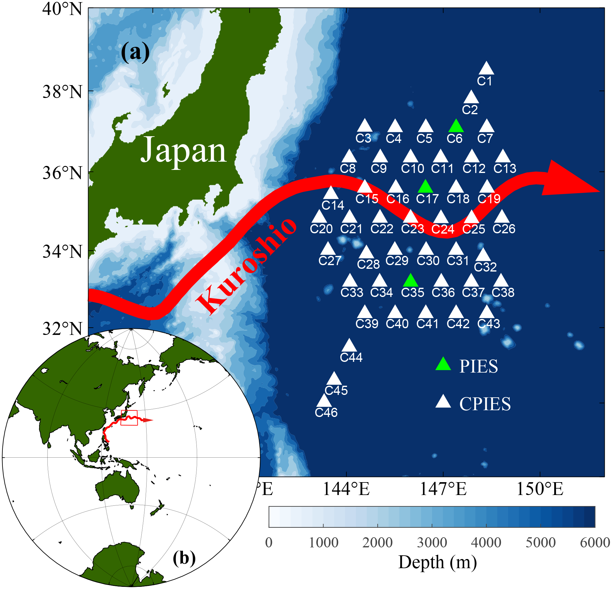 Schematic diagram of the Kuroshio Extension System Study (KESS) observation array. White and green triangles indicate pressure-equipped inverted echo sounders (PIESs) and current- and pressure-equipped inverted echo sounders (CPIESs), respectively [region shown in (A) is indicated by the red box in (B)].