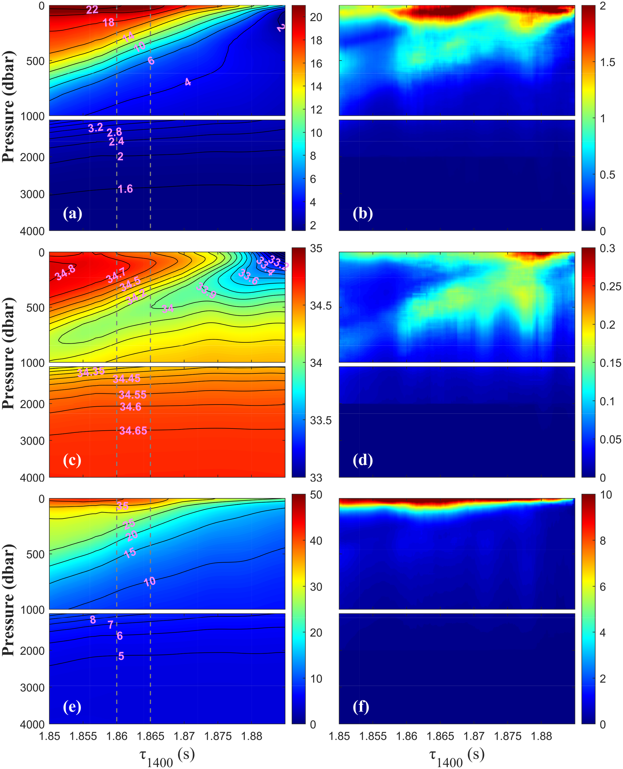 The GEM method, which is an empirical lookup table from historical hydrographic profiles, was applied to obtain temperature, salinity, and specific volume anomaly fields from CPIES observations (Watts et al., 2001). Following Donohue et al. (2010), we constructed a GEM lookup table based on τ1400 (Figure 2). The maximum error in temperature and salinity occurred at 0–200 dbar, with τ1400 ranging from 1.86–1.88 s, which was generally consistent with Donohue et al. (2010). Smaller errors appeared in the deep ocean; temperature (salinity) errors were 0.55, 0.16, and 0.03°C (0.10, 0.03, and 0.01) at 500, 1,000, and 2,000 dbar, respectively.
